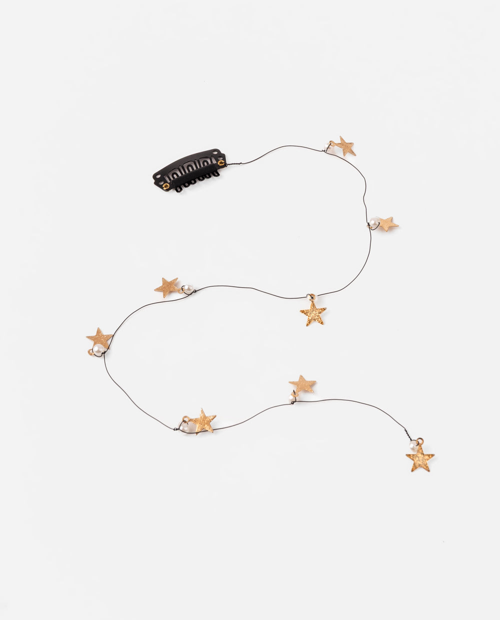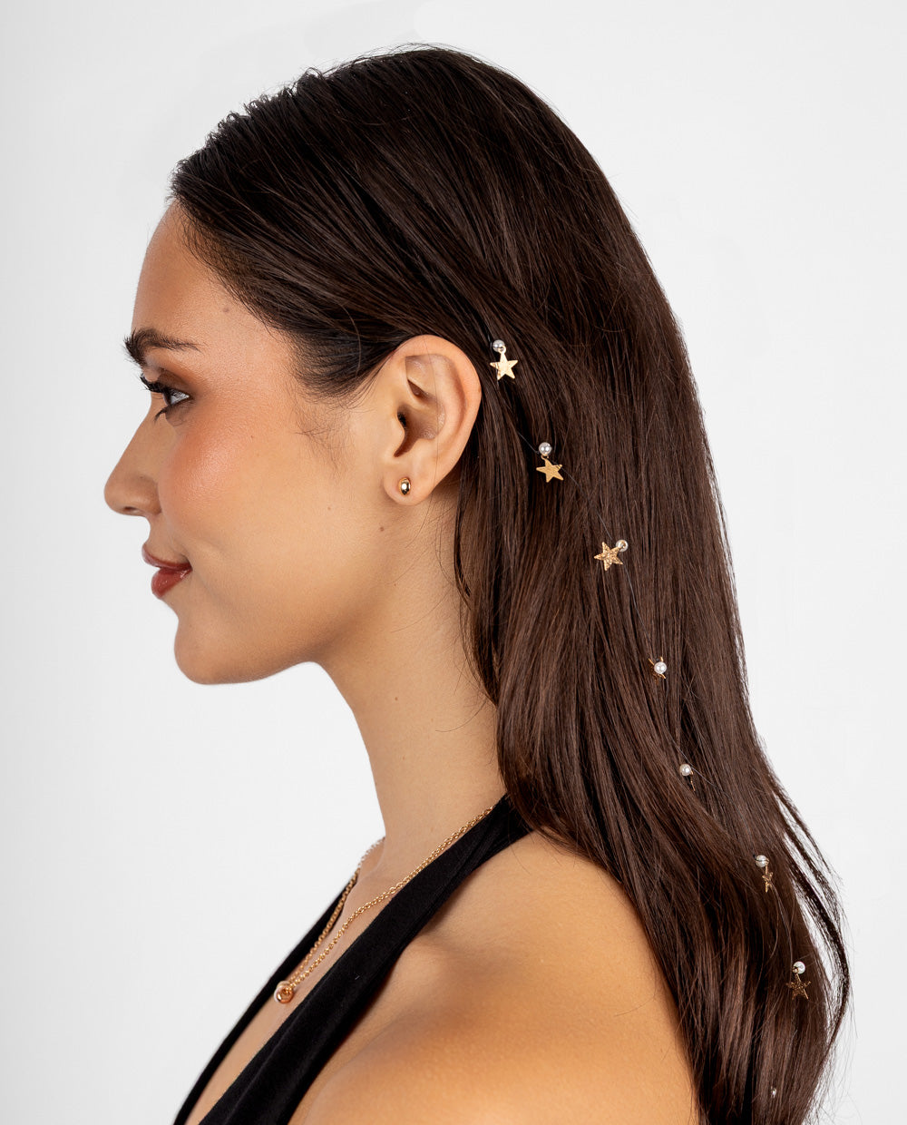 Deja que tu look brille con este delicado gancho para el cabello adornado con estrellas doradas. Su diseño ligero y femenino se integra perfectamente al peinado, dándole un toque mágico y sofisticado. Ideal para realzar tu estilo en celebraciones, fiestas o noches especiales.