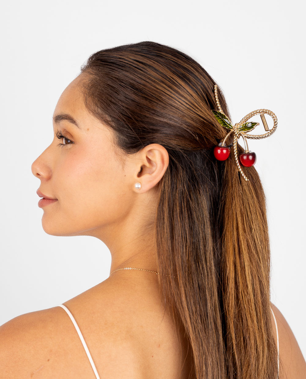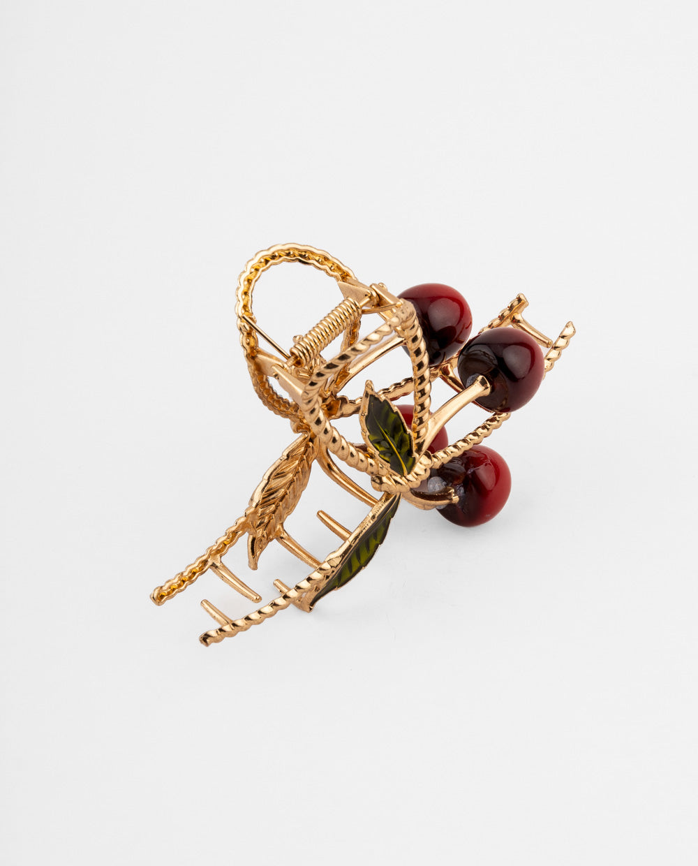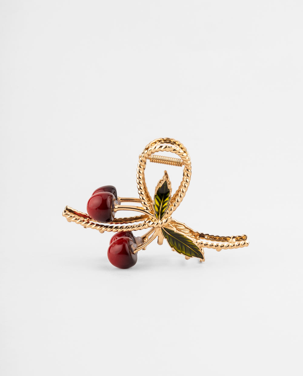 Gancho metálico dorado con diseño de lazo, cerezas rojas y hojas verdes esmaltadas. Su estructura trenzada aporta firmeza y un toque sofisticado.