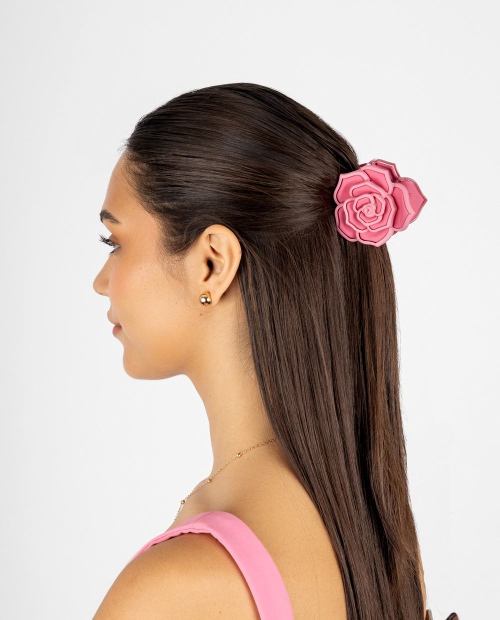Gancho de cabello con diseño de rosa en acabado mate, ideal para dar un toque romántico y femenino a cualquier peinado.