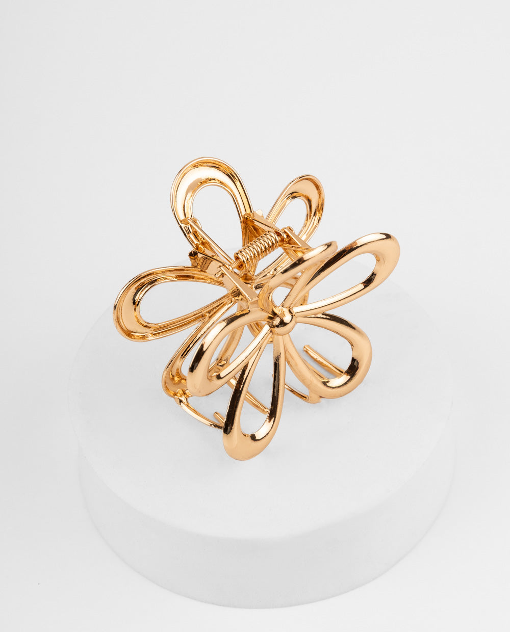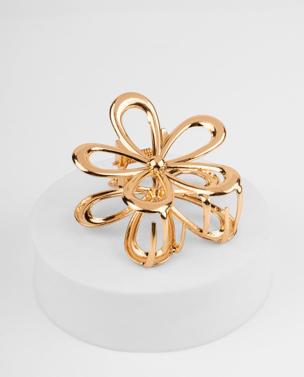 Este gancho en forma de flor metálica es ideal para peinados pulidos con un toque moderno y sofisticado. Su diseño calado en tono dorado resalta en recogidos y medios moños, brindando sujeción y estilo en un solo accesorio. Perfecto para elevar tus looks urbanos o darle brillo a tus básicos.