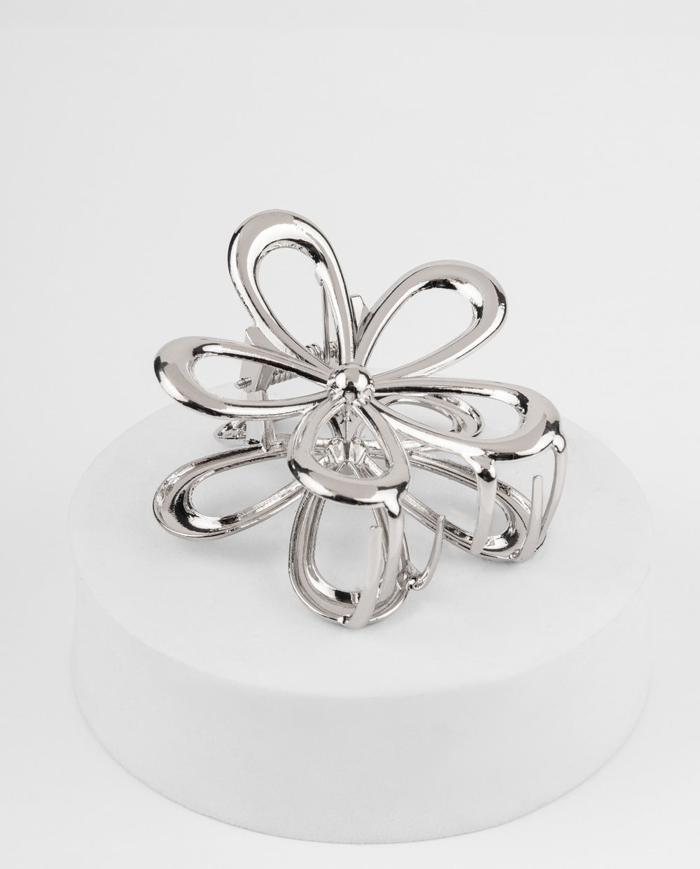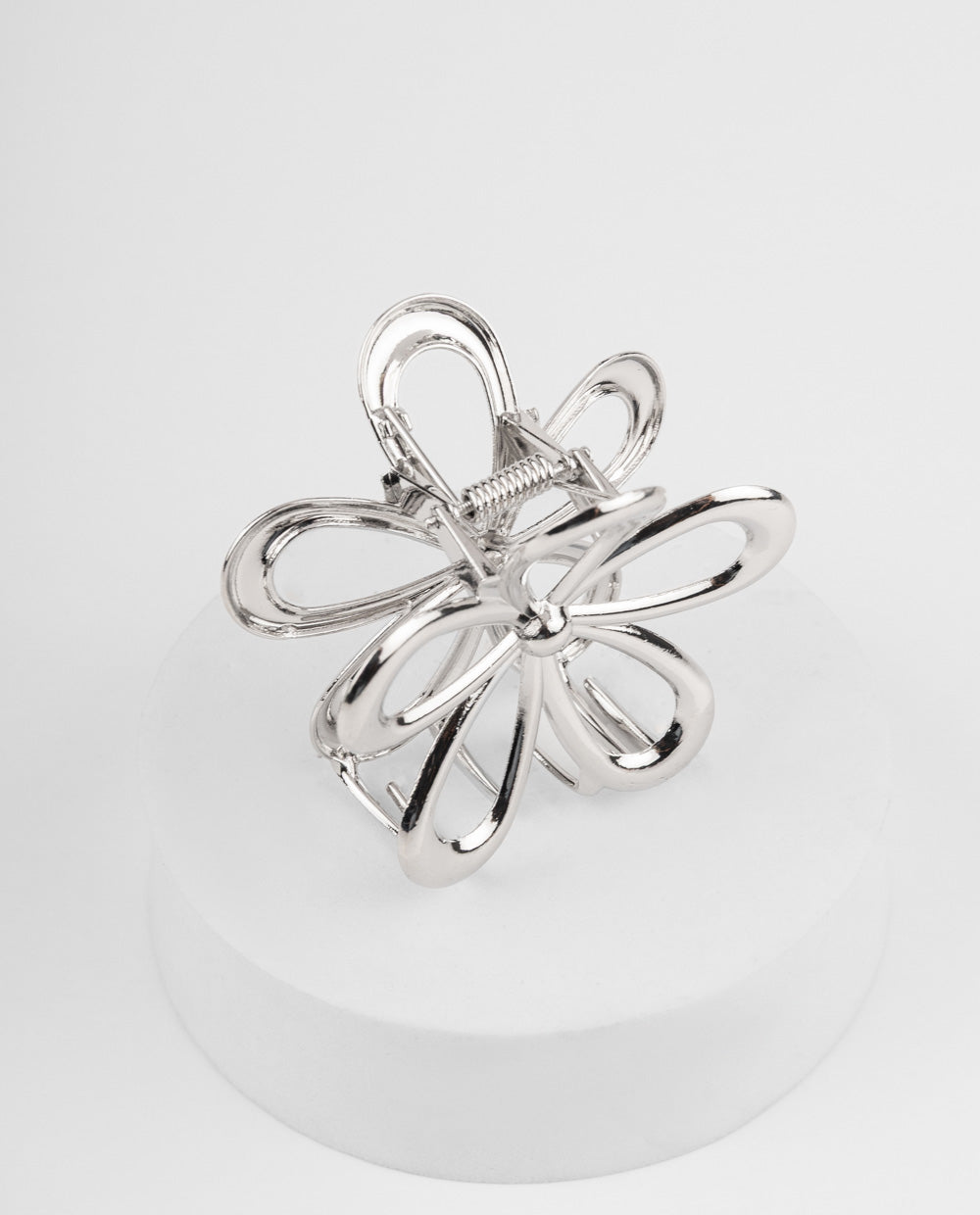 Este gancho en forma de flor metálica es ideal para peinados pulidos con un toque moderno y sofisticado. Su diseño calado en tono plateado resalta en recogidos y medios moños, brindando sujeción y estilo en un solo accesorio. Perfecto para elevar tus looks urbanos o darle brillo a tus básicos.
