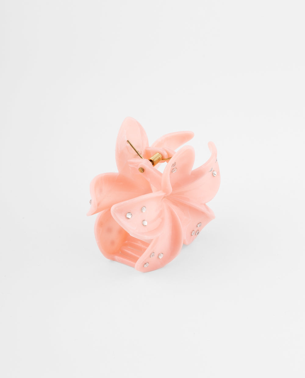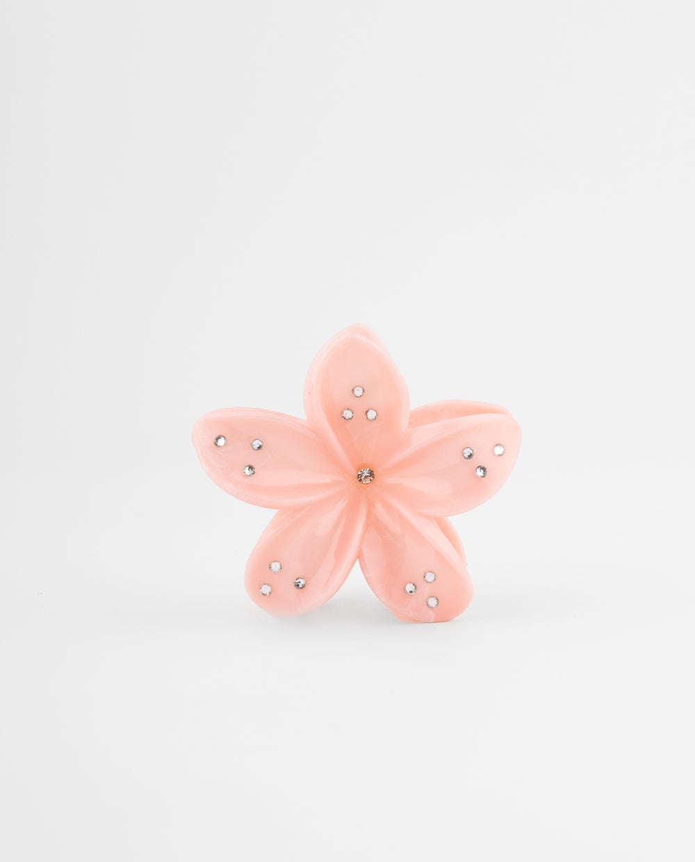 Gancho en forma de flor rosada con pétalos facetados y detalles de strass que aportan brillo delicado y femenino.