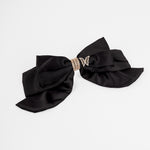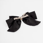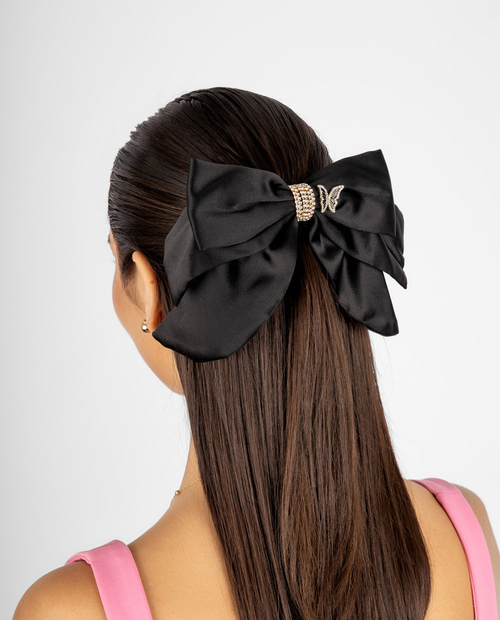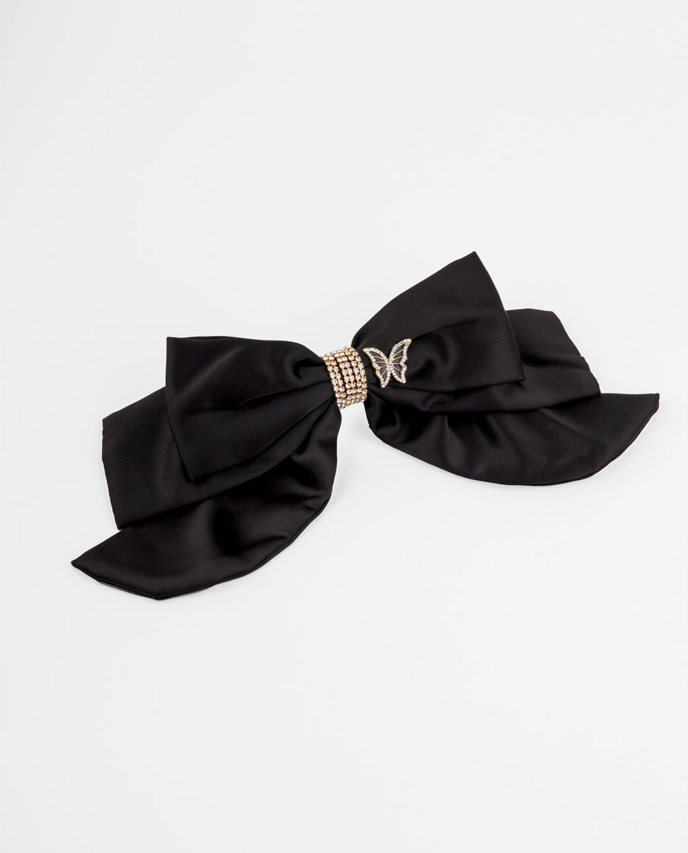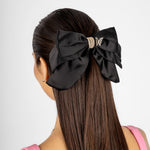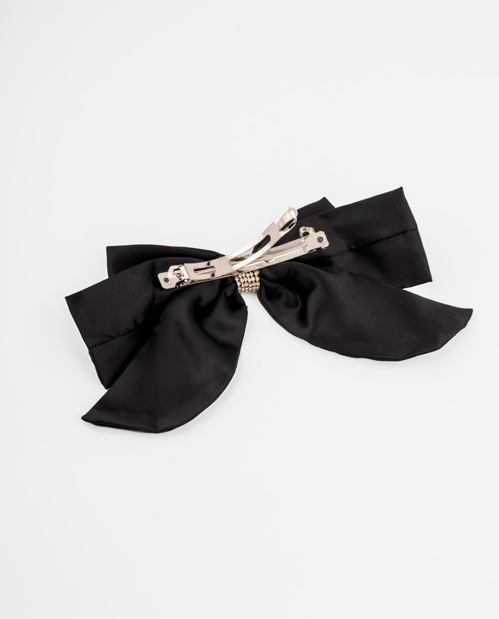Gancho tipo lazo en tela negra, decorado con un aplique central de brillo que aporta un acabado elegante y delicado para complementar tus peinados.