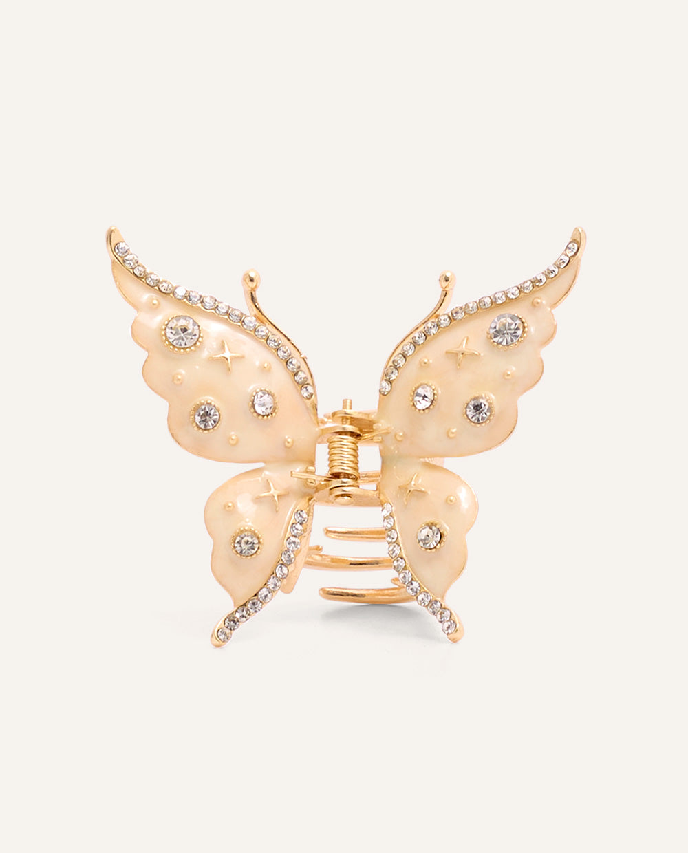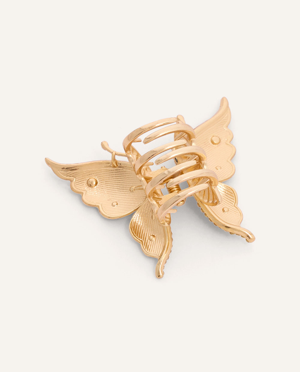 Gancho de metal en forma de mariposa con detalles brillantes.