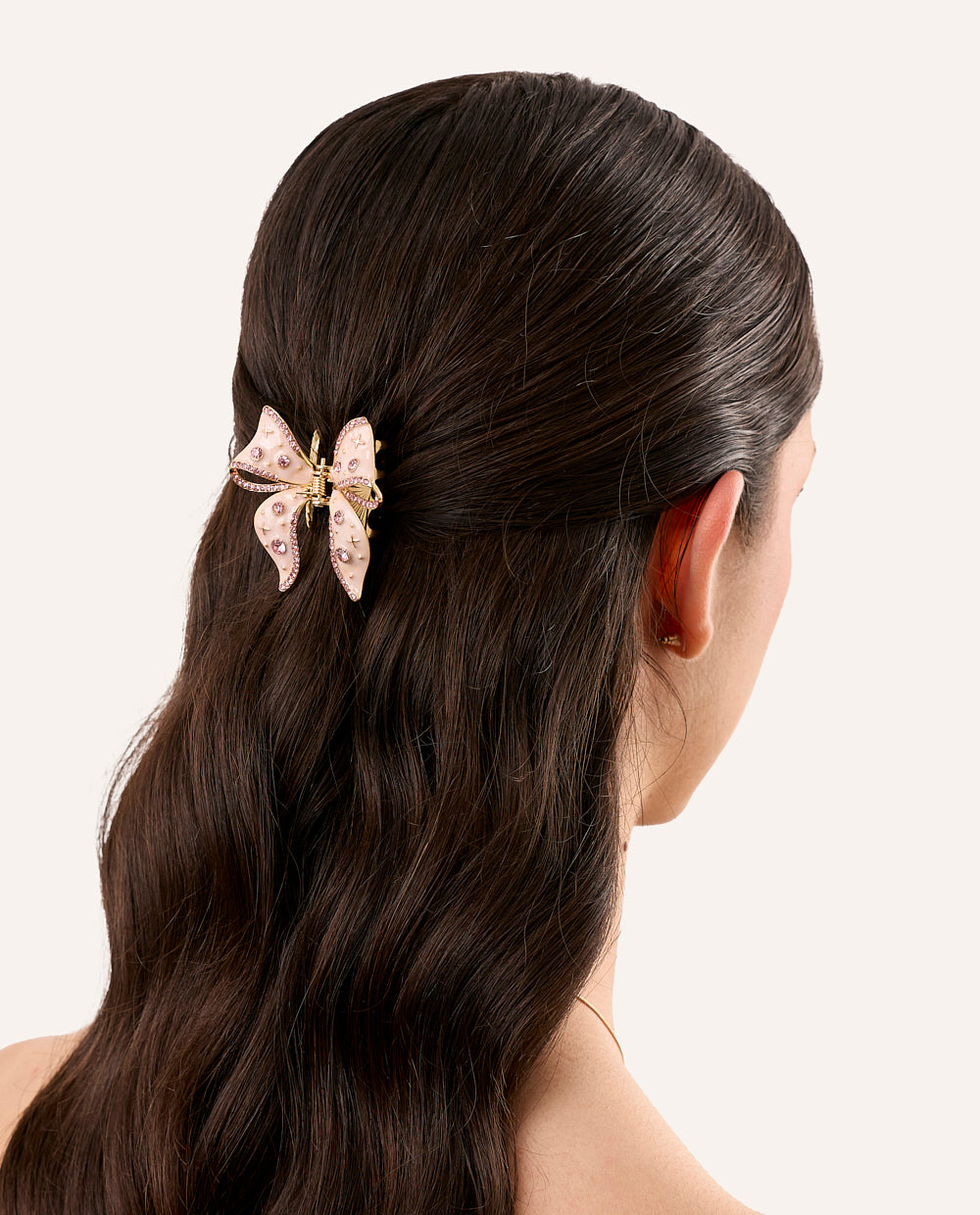 Gancho de metal en forma de mariposa con detalles brillantes.
