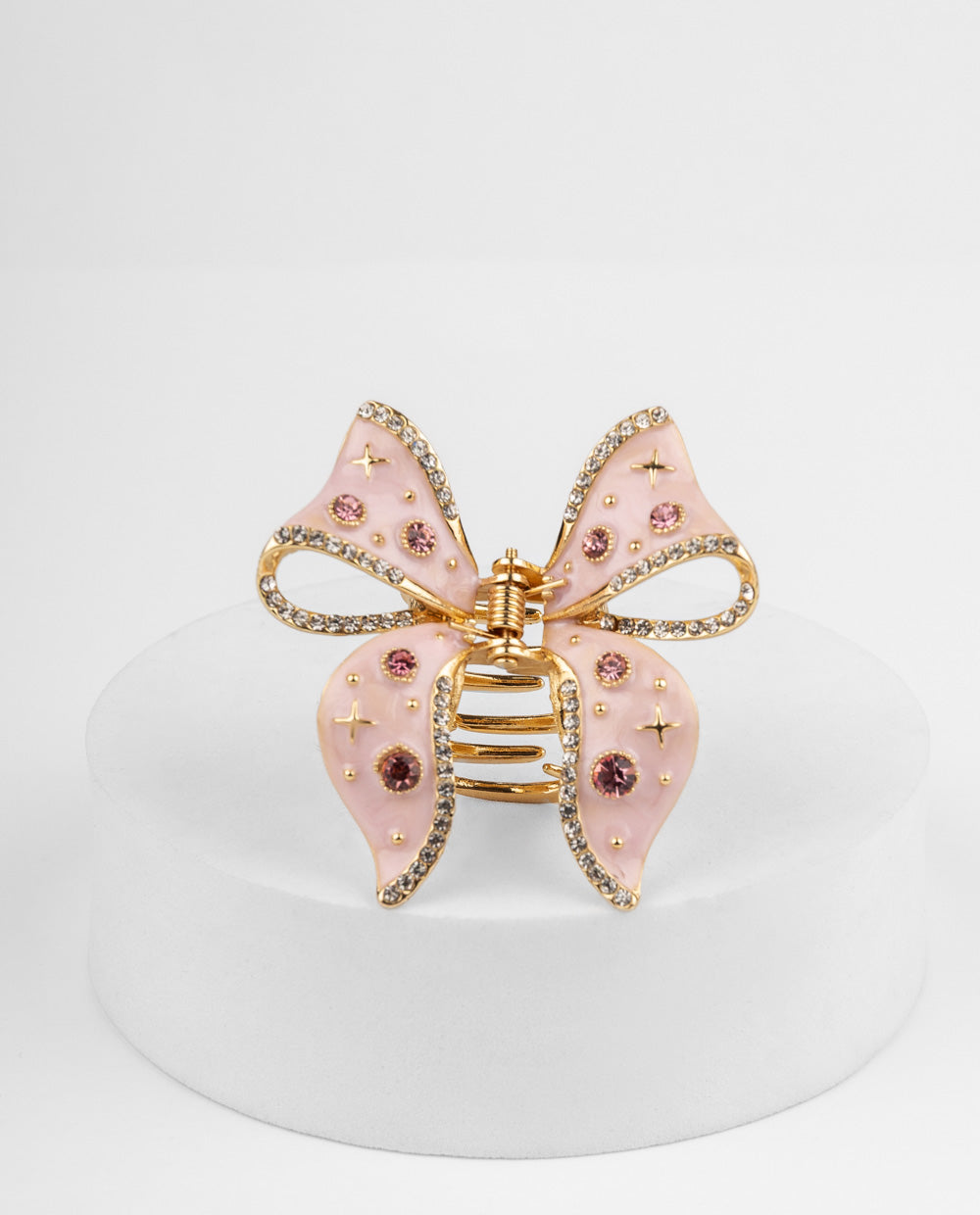 Este gancho en forma de moño combina estructura metálica dorada, esmalte rosado y detalles brillantes que aportan un acabado glamoroso y delicado. Su tamaño compacto sujeta el cabello de forma segura, ideal para recogidos coquetos o semirecogidos elegantes. Es perfecto para complementar peinados festivos, looks románticos o elevar tu estilo diario con un toque de brillo.