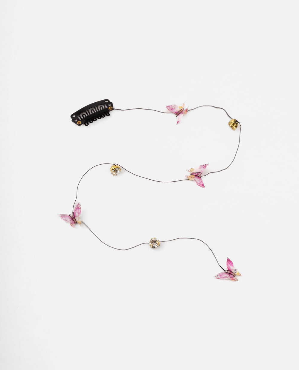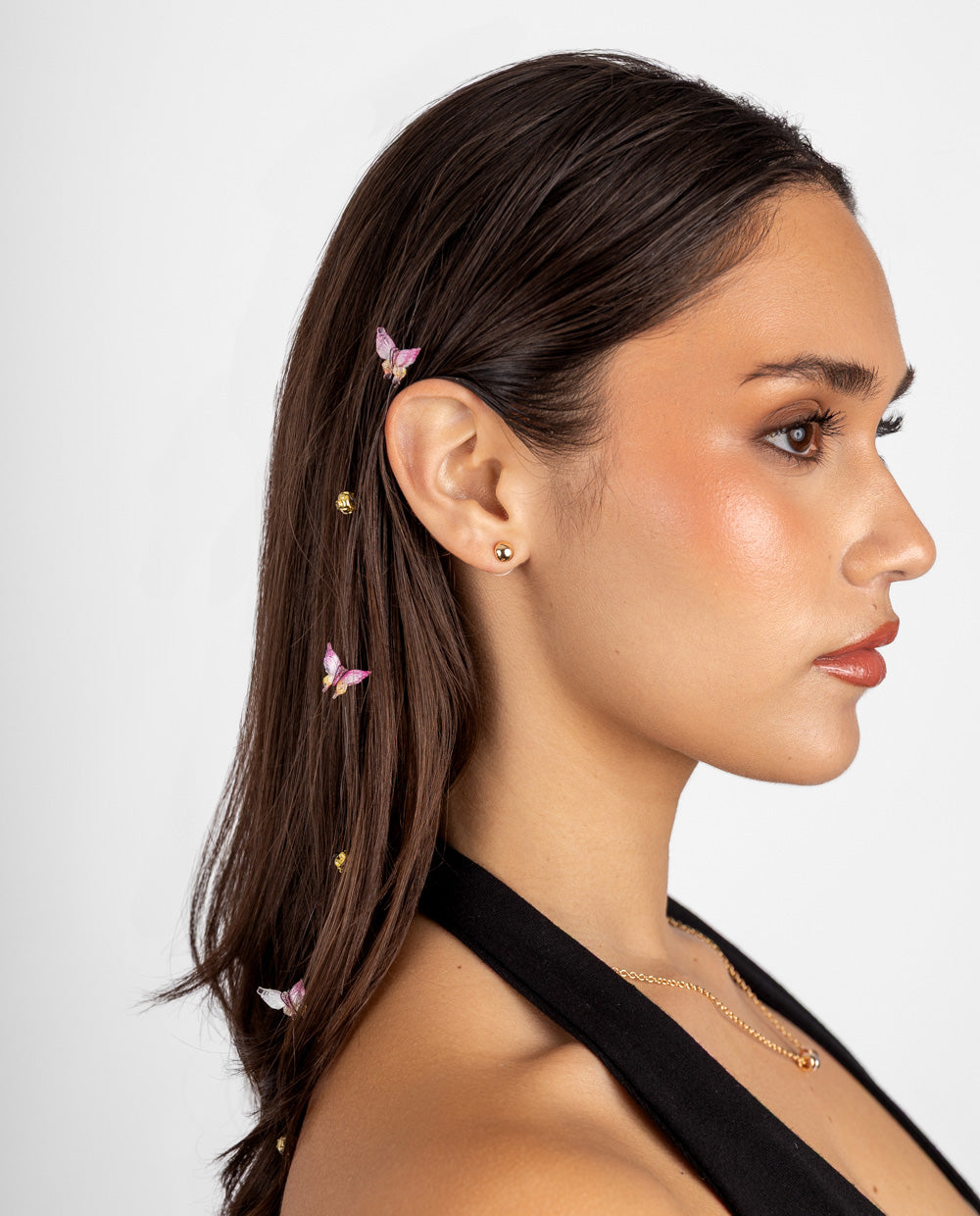 Luce un peinado encantador con este gancho adornado con delicadas mariposas rosas y detalles dorados. Un accesorio versátil que aporta un brillo romántico y femenino, ideal para elevar tu estilo diario o acompañar tus looks en celebraciones especiales.