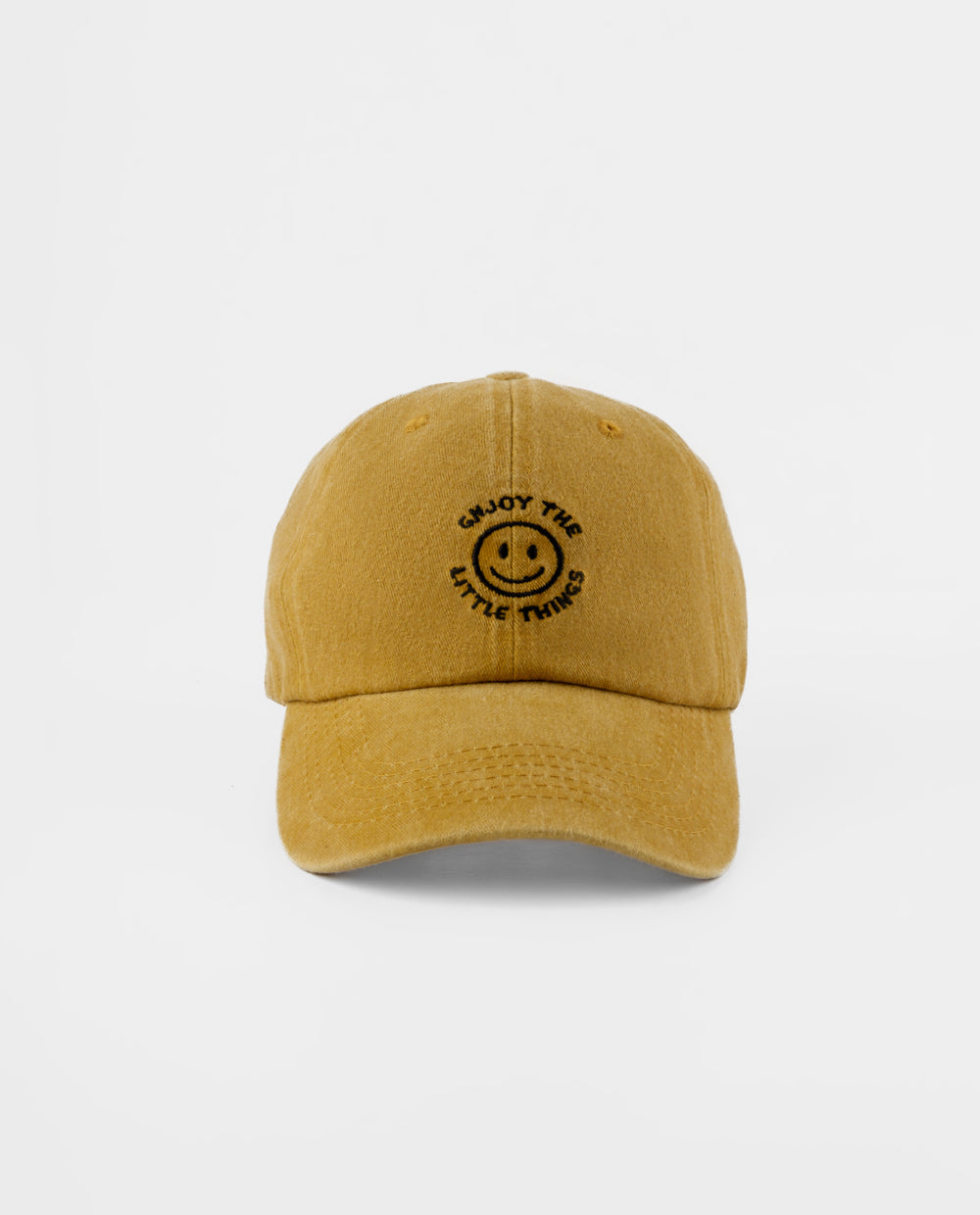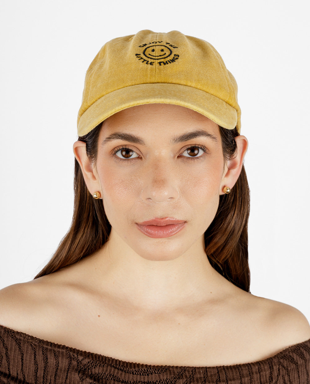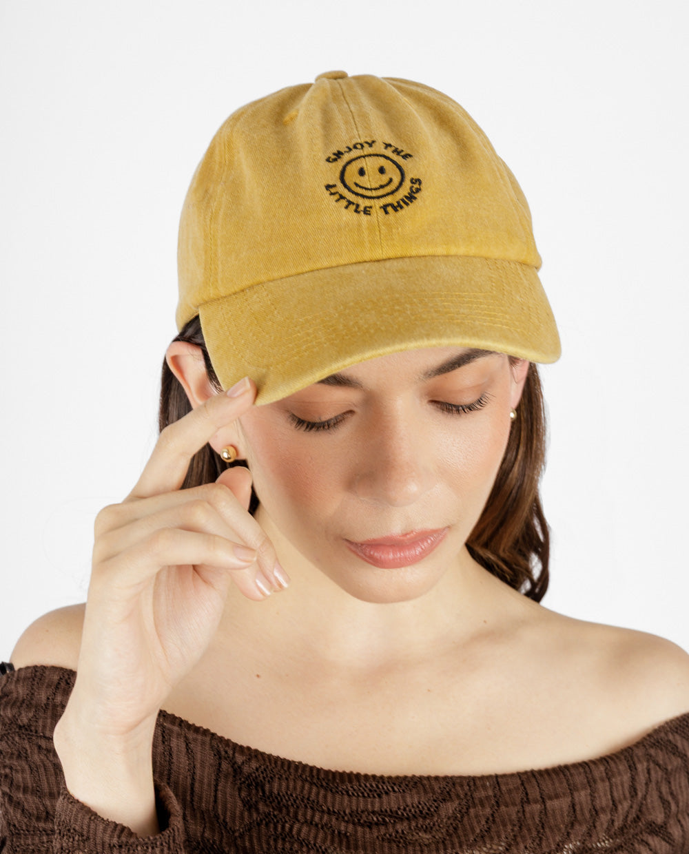 Gorra urbana en tono mostaza con acabado tipo felpa, fabricada en algodón suave al tacto. Cuenta con bordado frontal de carita feliz y el mensaje "Enjoy the Little Things", que invita a mantener una actitud positiva todos los días. Su diseño clásico con visera curva y cierre ajustable la hace perfecta para paseos al aire libre, looks casuales de fin de semana o darle un toque relajado a tus outfits urbanos. Ideal para complementar estilos coquette o comfy con un toque divertido.