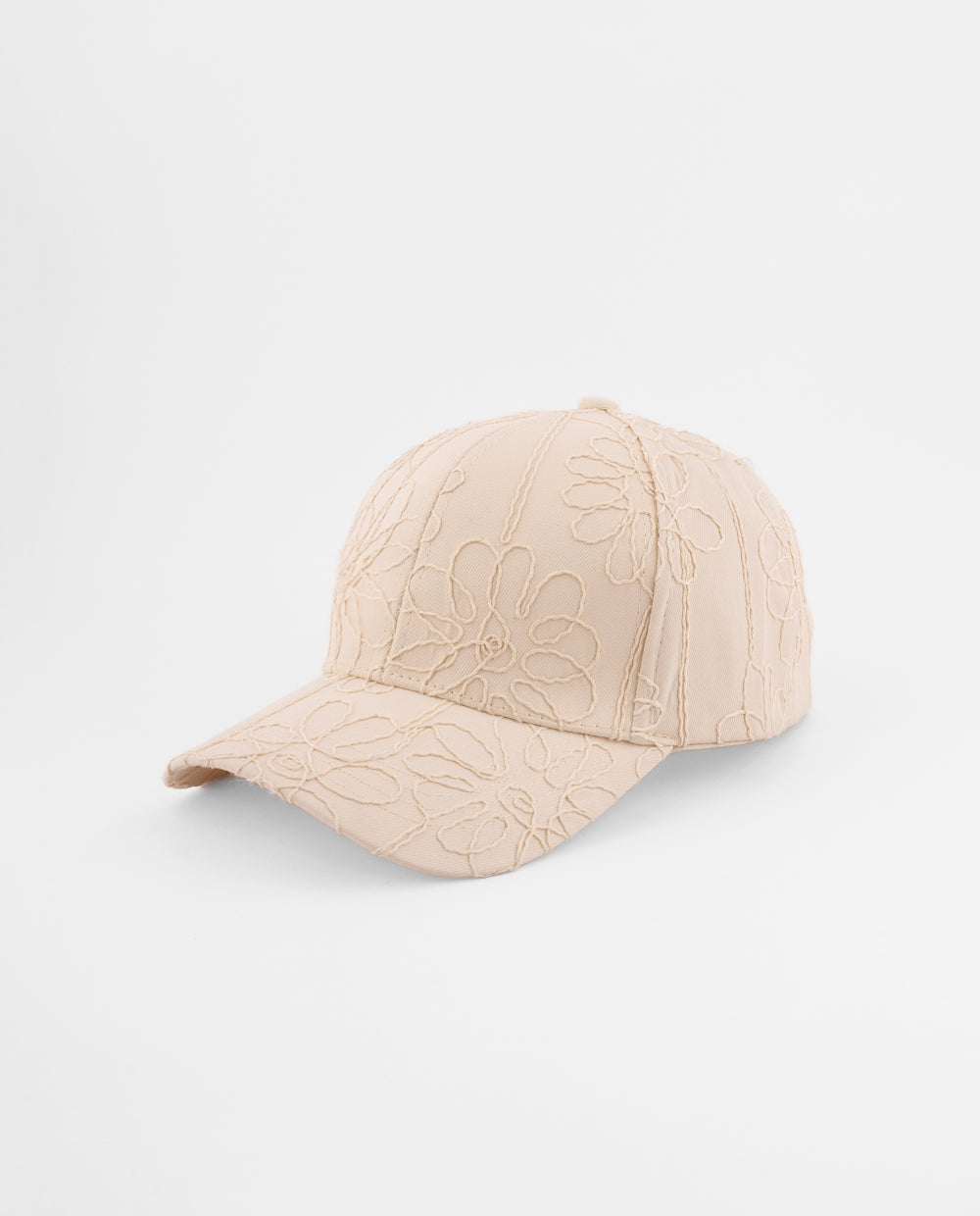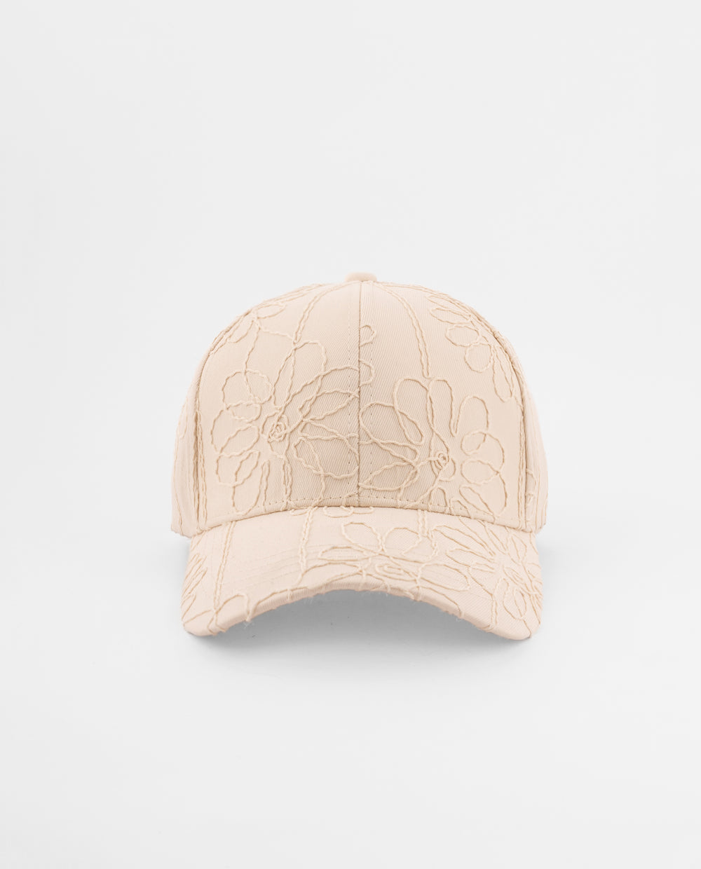 Gorra beige con textura floral bordada. Cuenta con visera curvada y ajuste trasero metálico regulable para un calce adaptable.