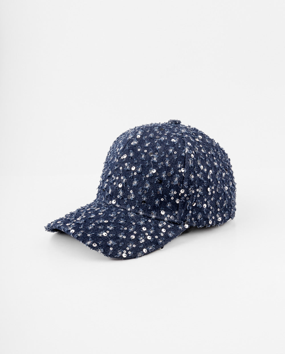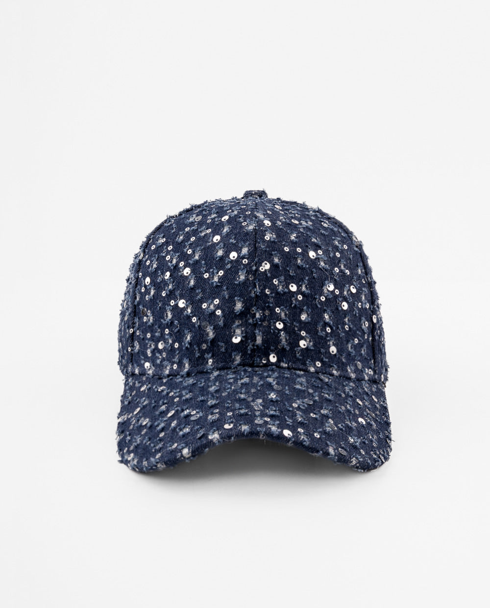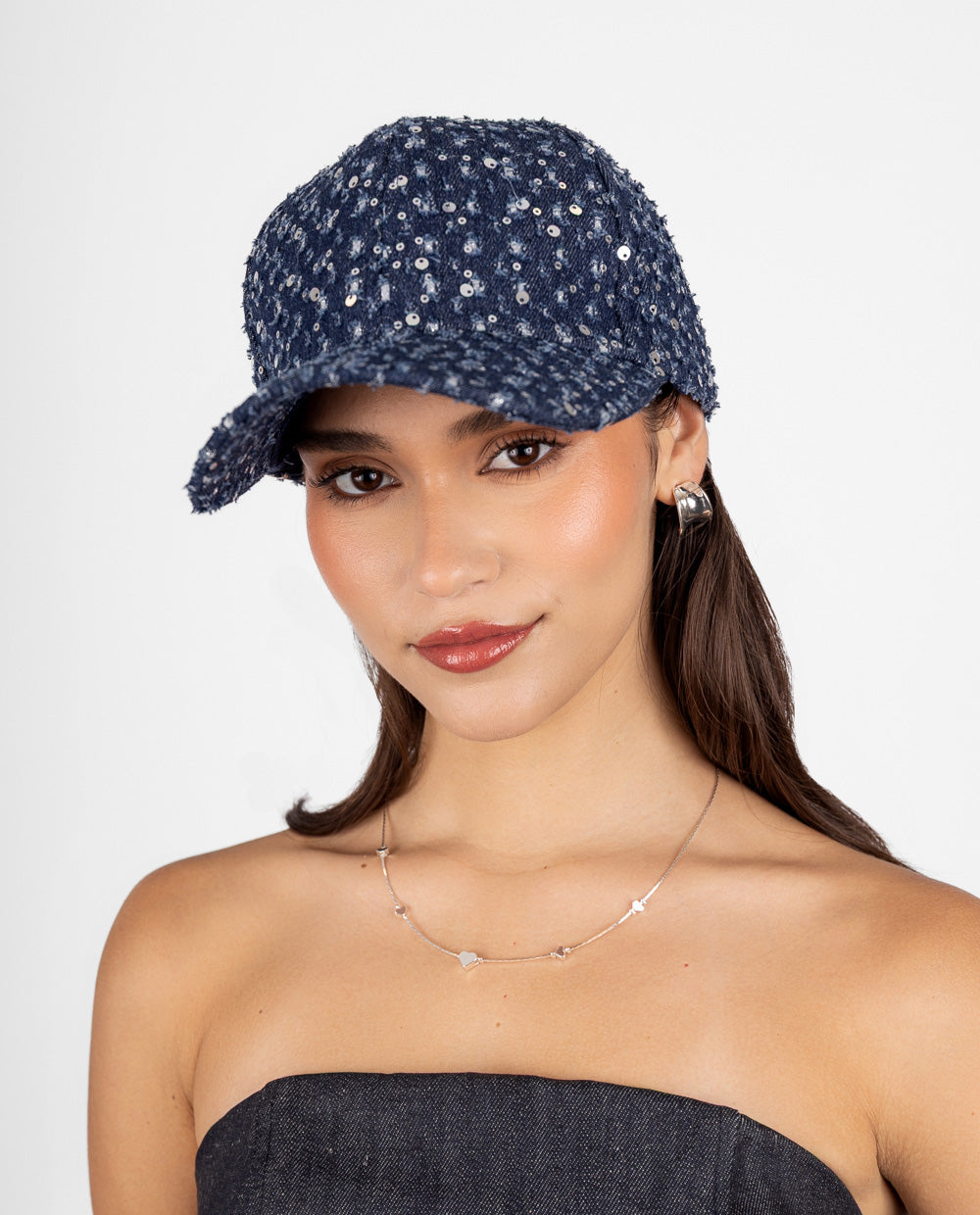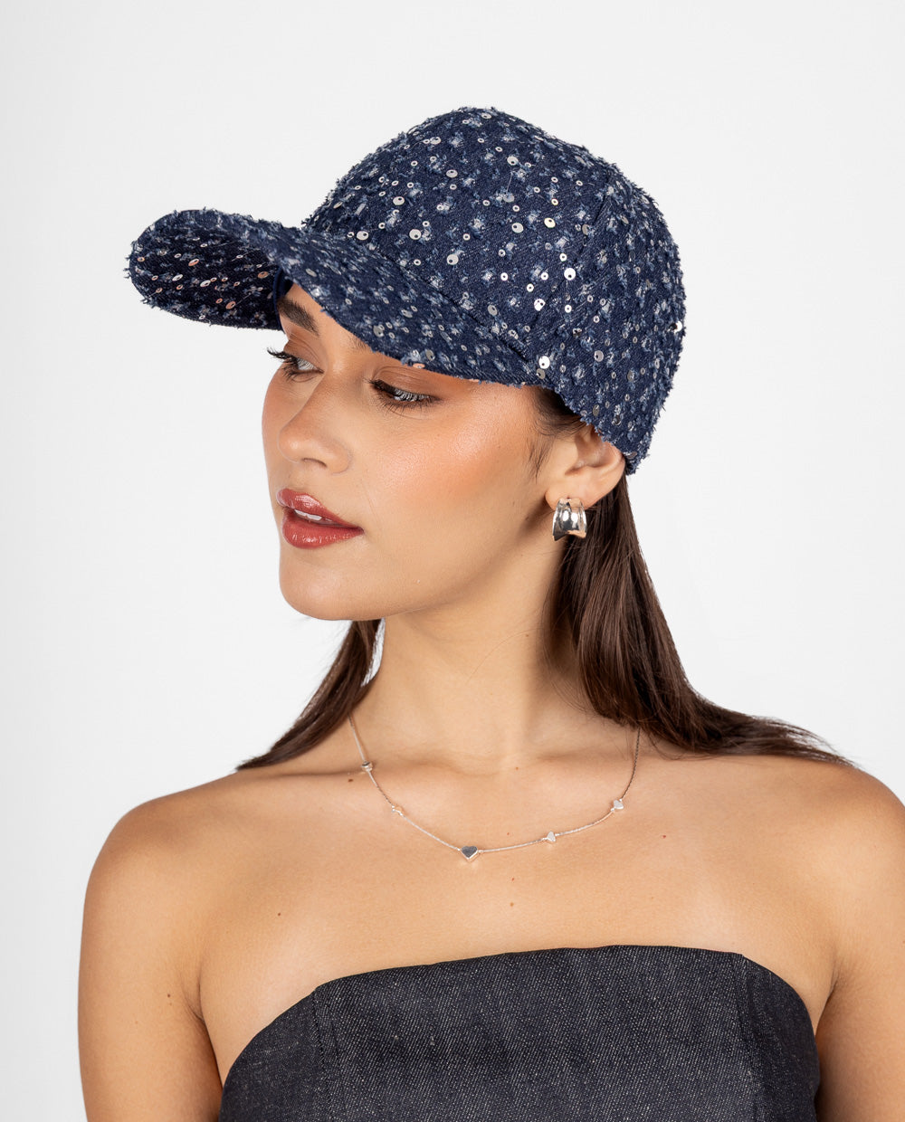 Gorra en denim azul oscuro con aplicaciones de lentejuelas plateadas que aportan brillo y un estilo llamativo. Perfecta para elevar un look urbano con un toque trendy, manteniendo comodidad y ajuste gracias a su diseño práctico. Ideal para sumarte a la tendencia Back to Denim con mucho estilo.
