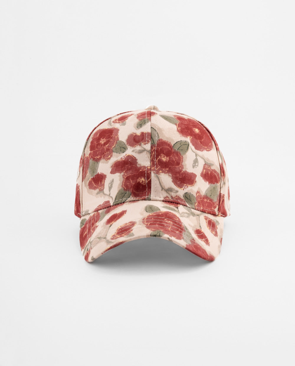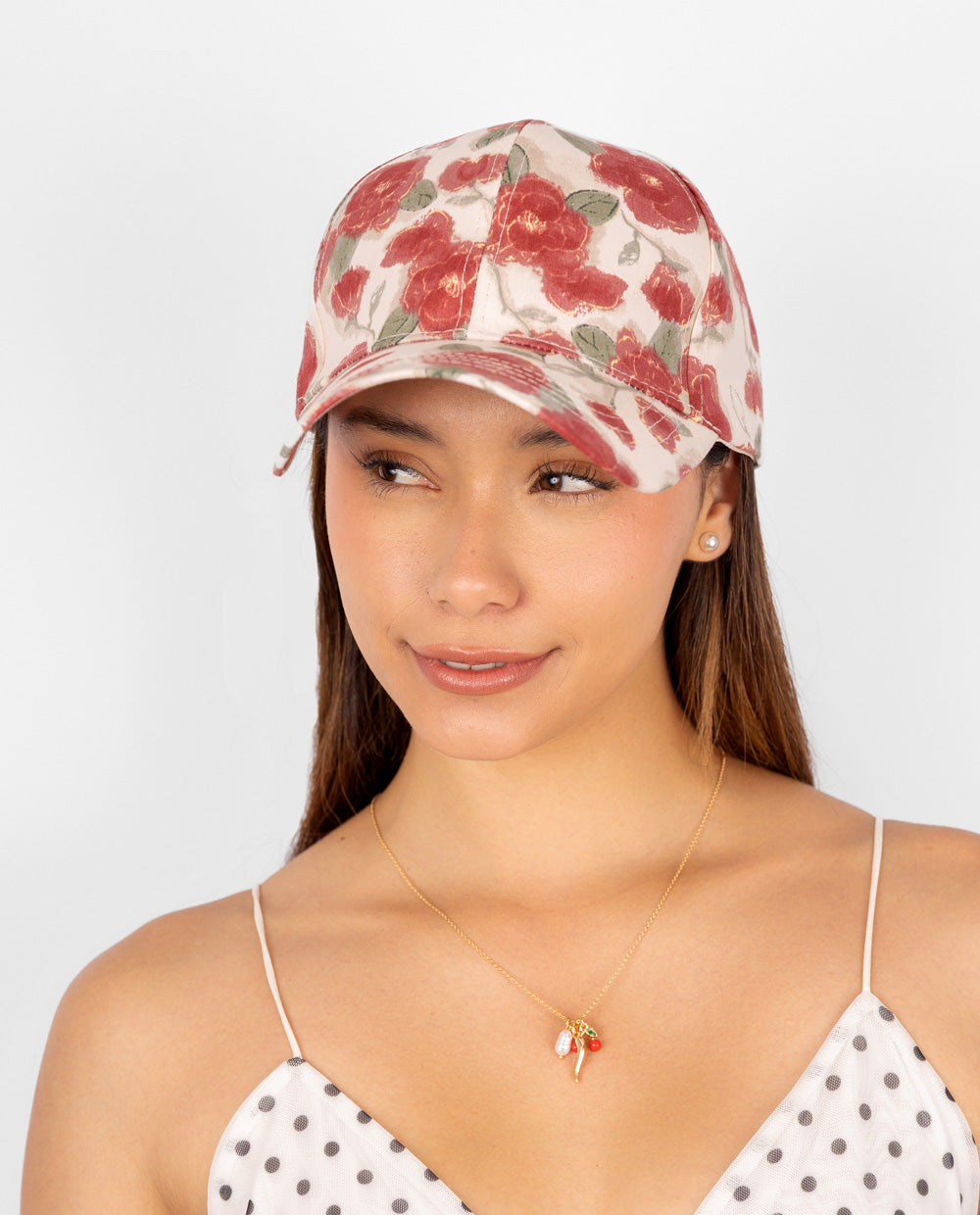 Gorra de algodón beige con estampado de rosas rojas y hojas verdes. Cuenta con visera curvada y ajuste trasero metálico, perfecta para darle un toque femenino y fresco a tus looks casuales o de paseo.