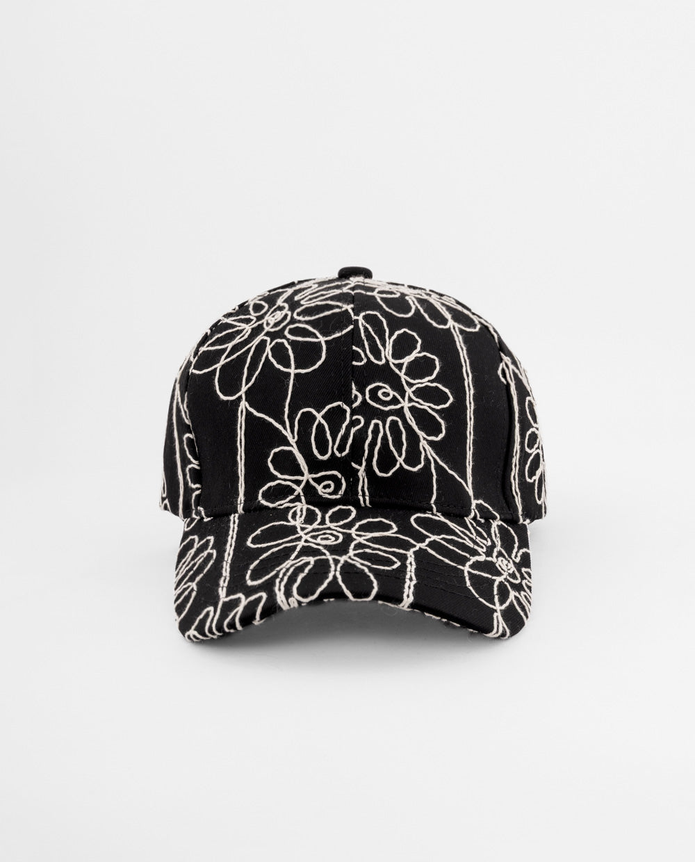 Gorra negra de algodón con diseño floral bordado en blanco. Cuenta con visera curvada y ajuste trasero metálico.