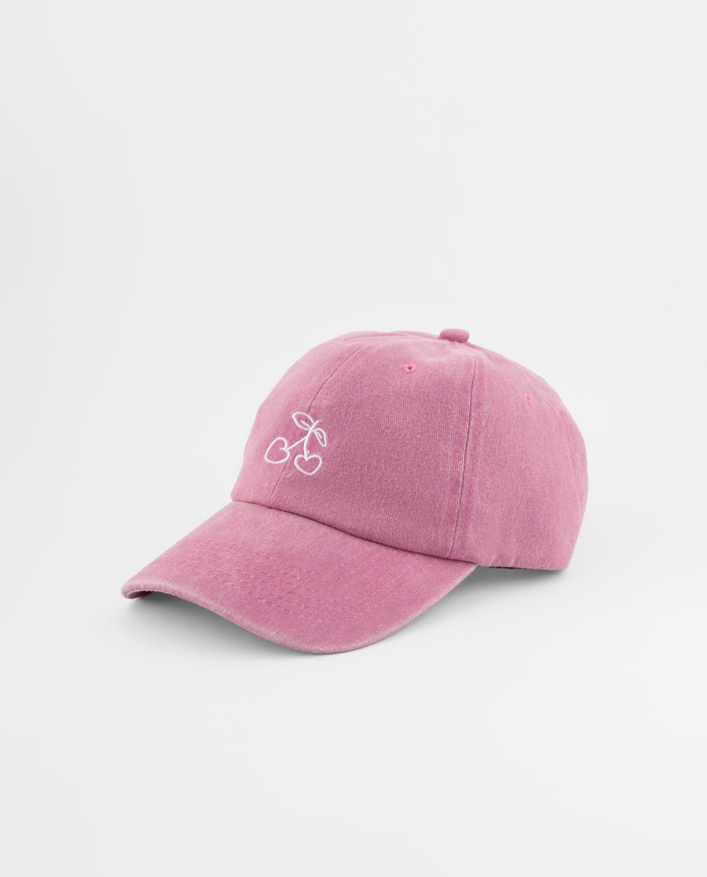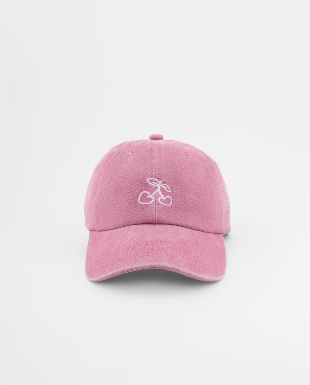 Gorra rosada con textura aterciopelada y bordado frontal de cerezas. Cuenta con visera curvada y ajuste trasero metálico regulable para un calce adaptable.