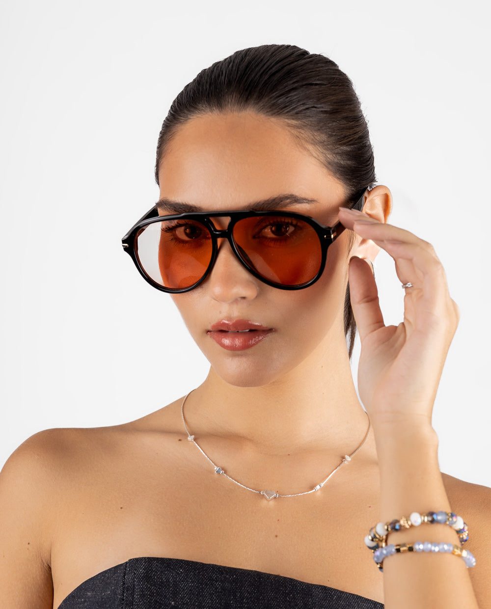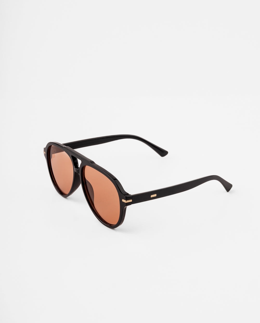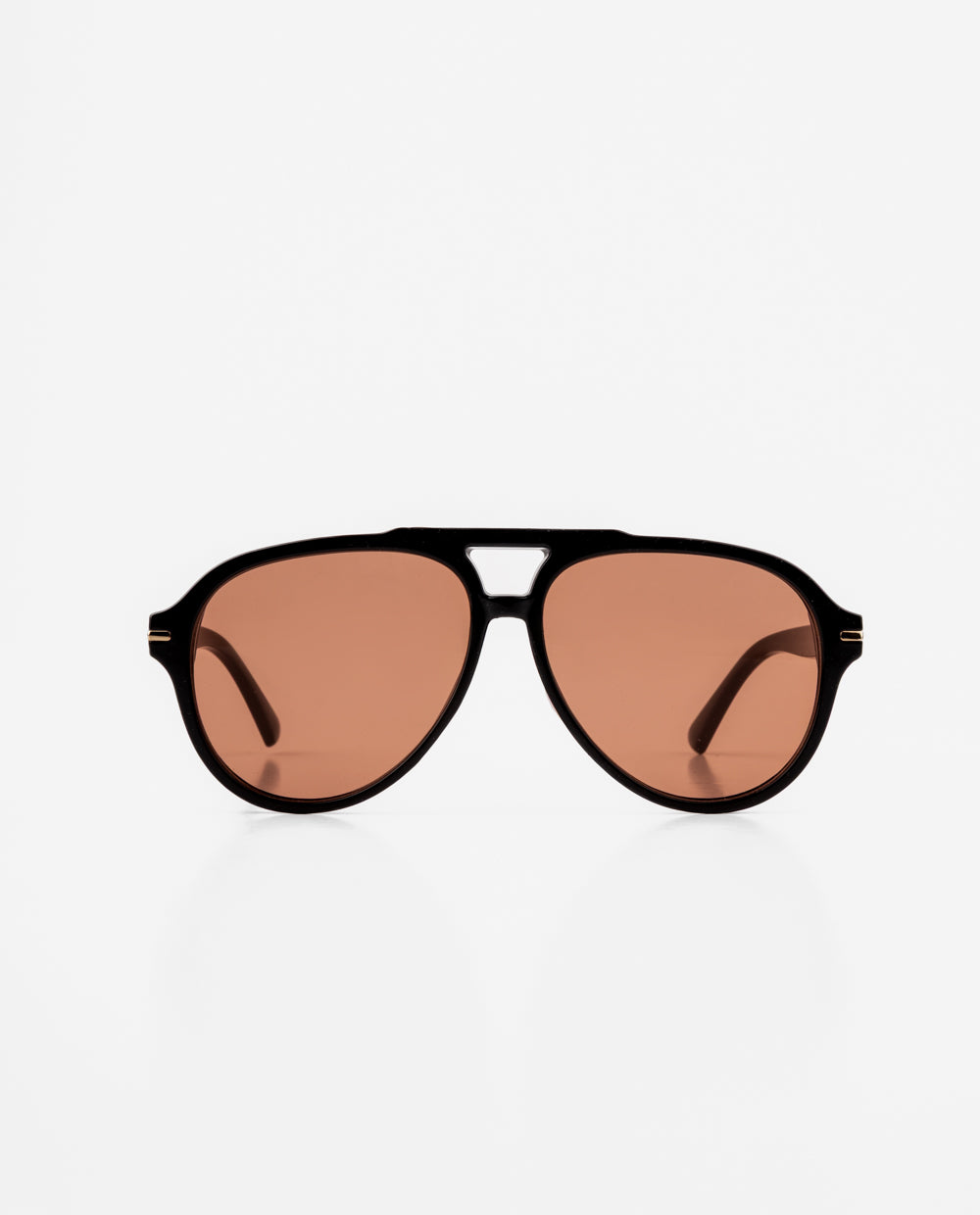 Lentes estilo aviador con montura negra y luna marrón, un diseño clásico y sofisticado que nunca pasa de moda. Ideales para complementar outfits casuales con denim o dar un aire urbano y elegante a tu estilo diario. Un accesorio atemporal que combina protección y carácter en cada ocasión.