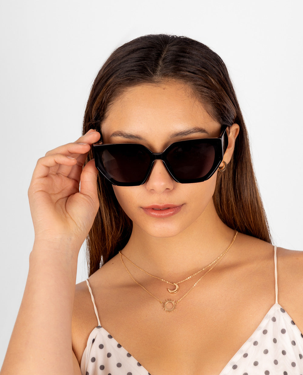 Lentes de sol de montura gruesa en color negro con diseño cuadrado y lunas degradadas. Su estructura amplia aporta un estilo moderno y atrevido.