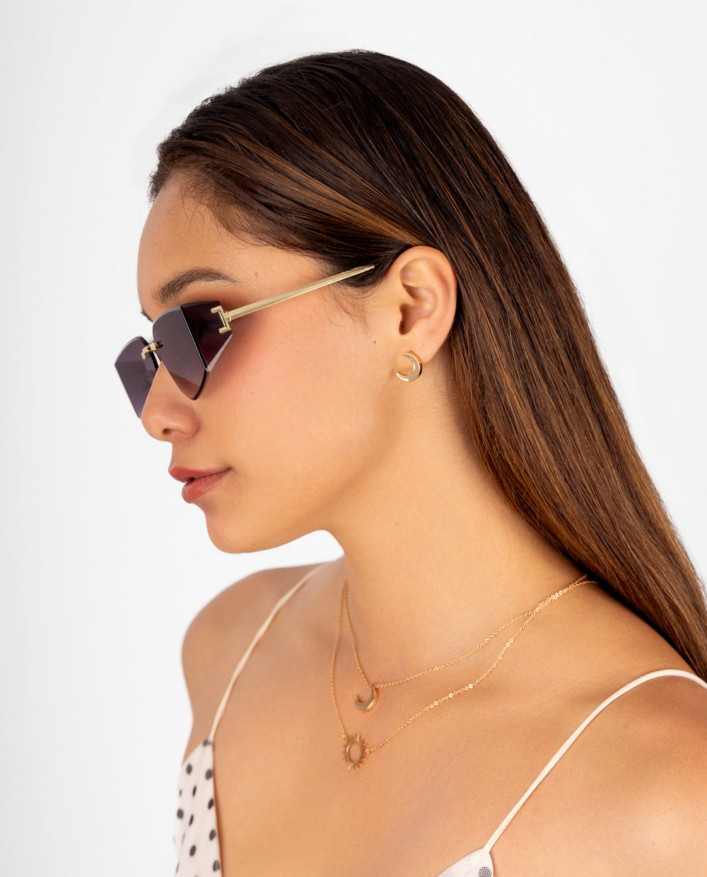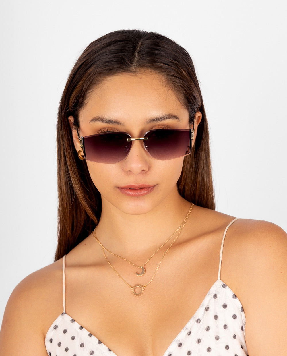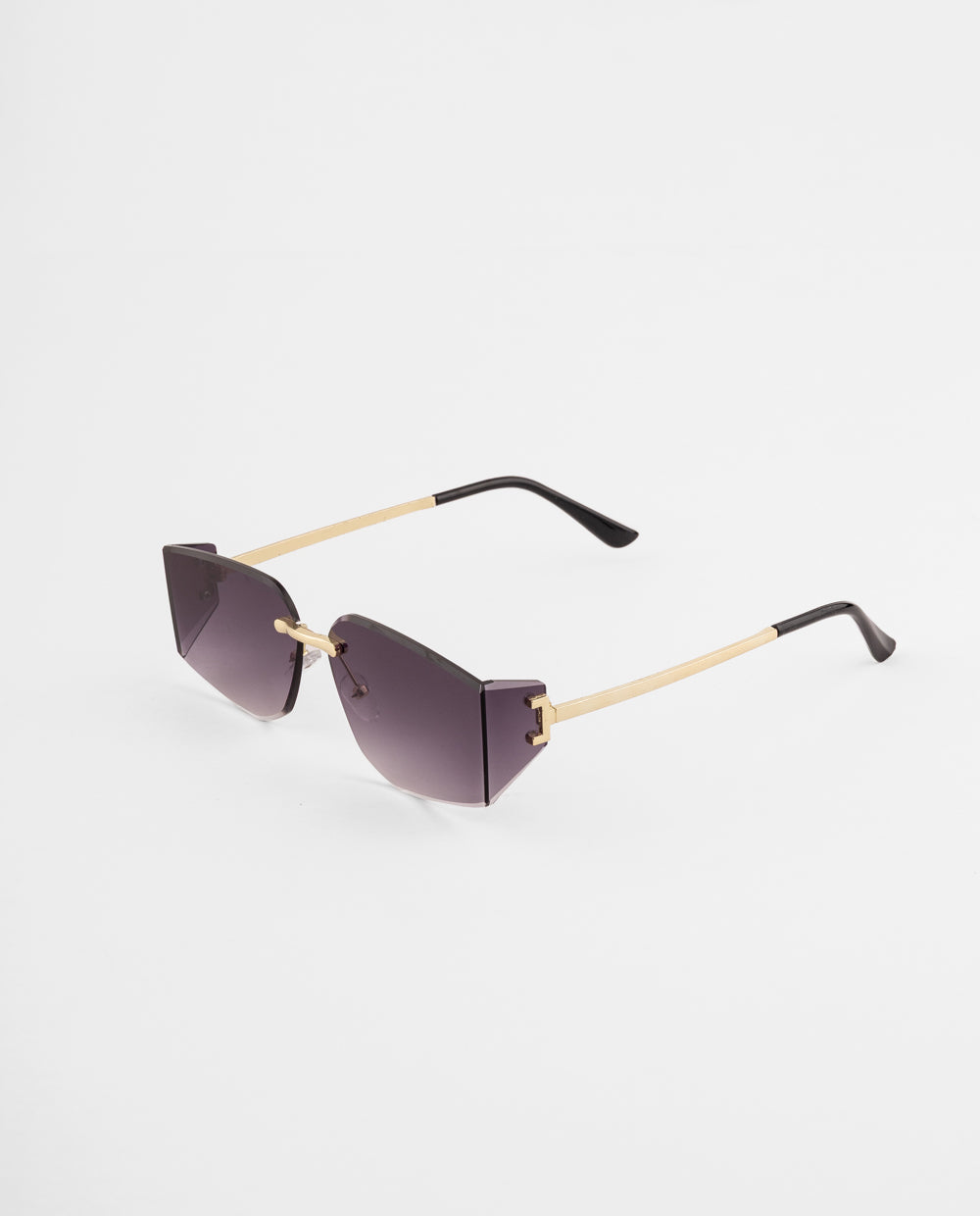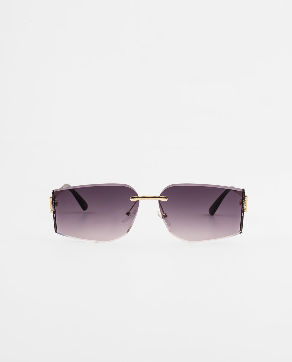 Lentes de sol sin marco con lunas moradas degradadas y montura metálica dorada. Su diseño geométrico es perfecto para complementar looks modernos o de verano con un toque de brillo.