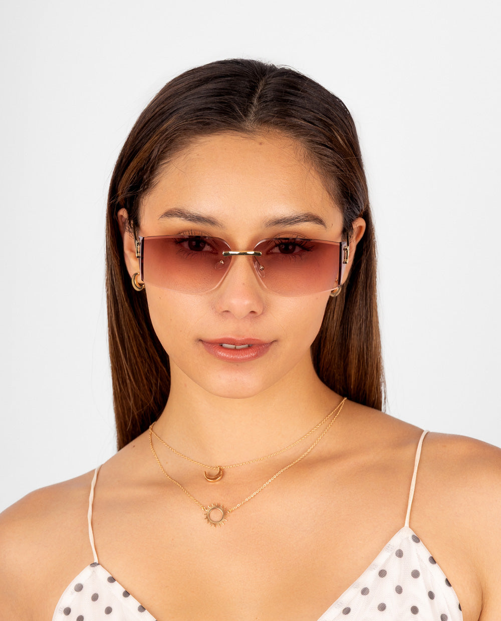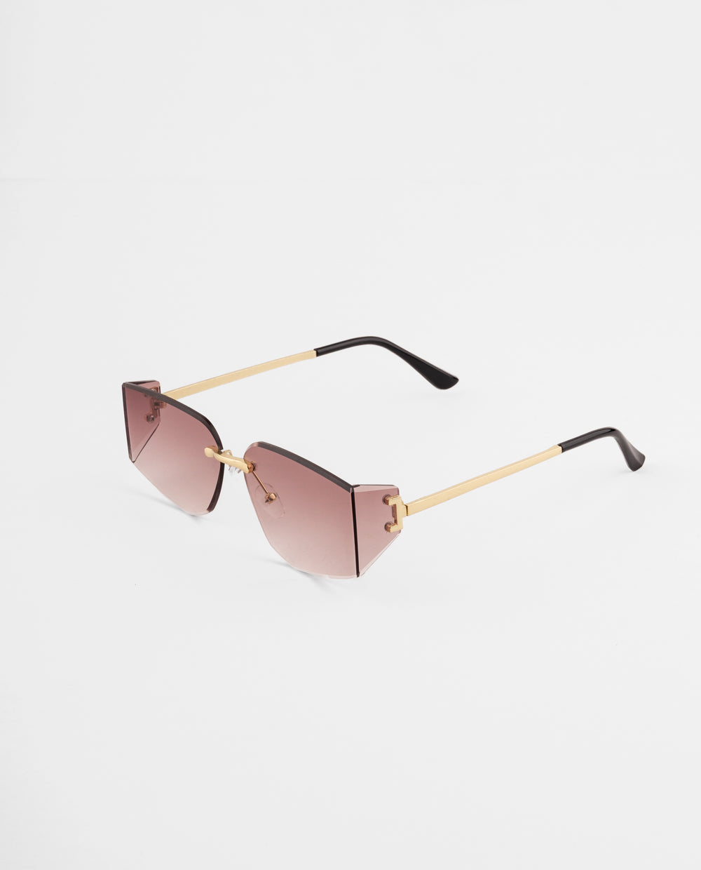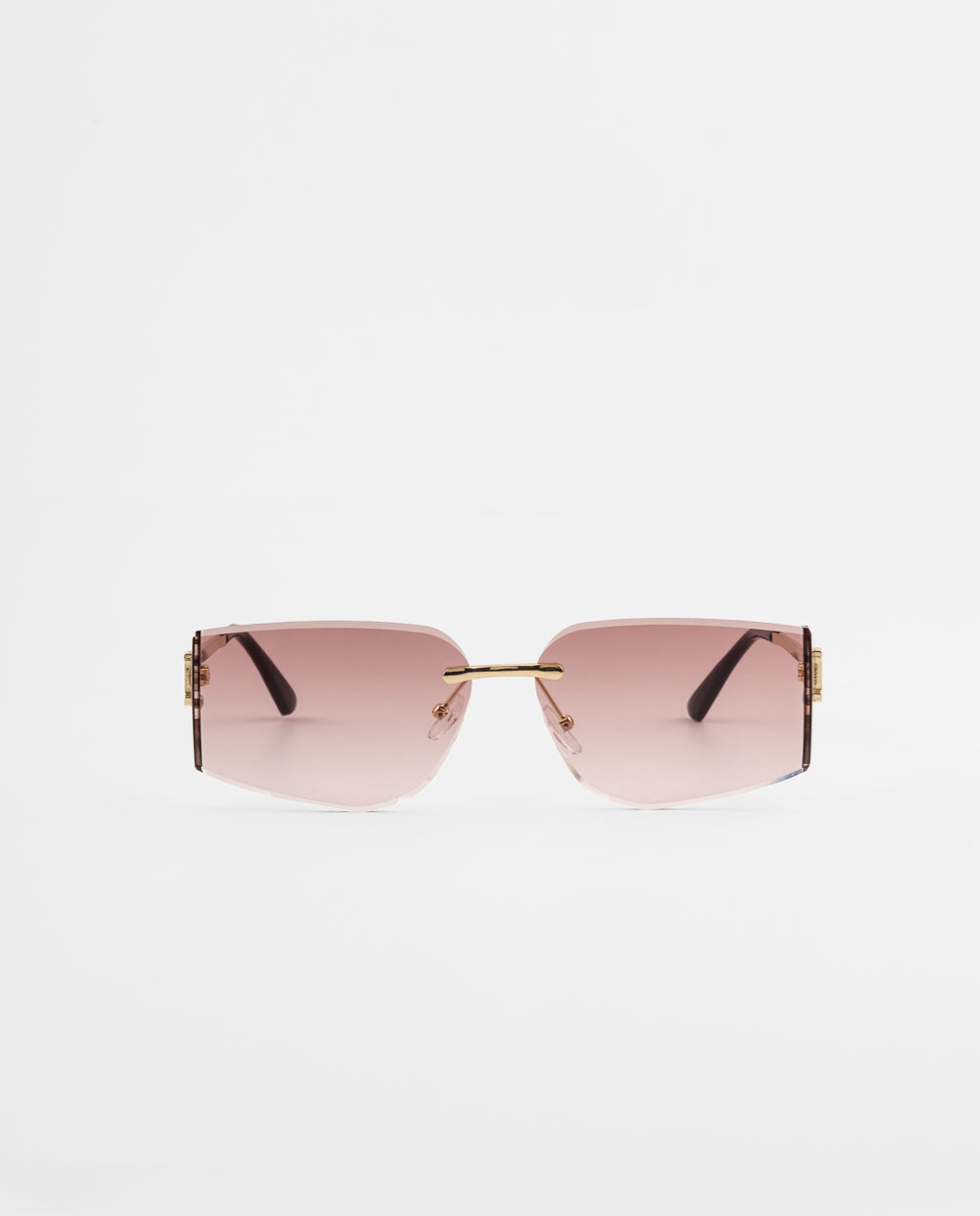 Lentes de sol sin marco con lunas rosadas degradadas y montura metálica dorada. Ideal para looks de verano o salidas de día donde quieras resaltar con estilo.