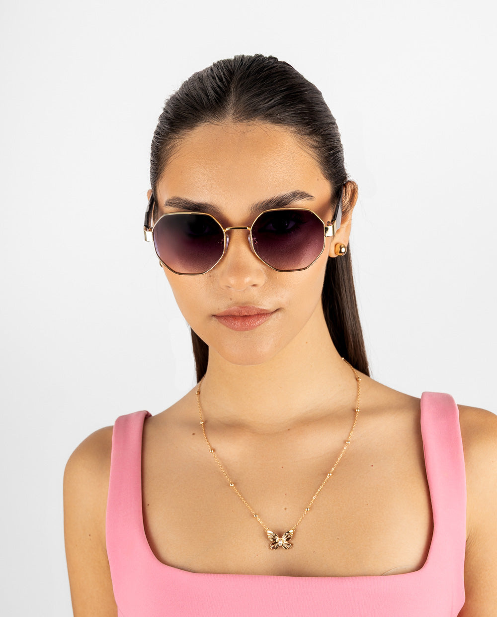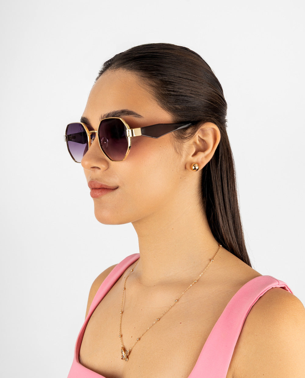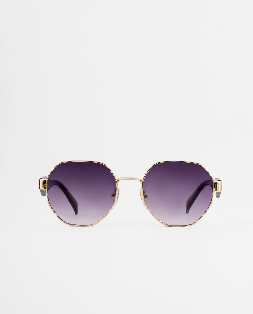 Lentes de sol con montura metálica dorada y lunas moradas en forma geométrica. Incluyen patillas anchas en tono negro que brindan comodidad y estabilidad al usar.