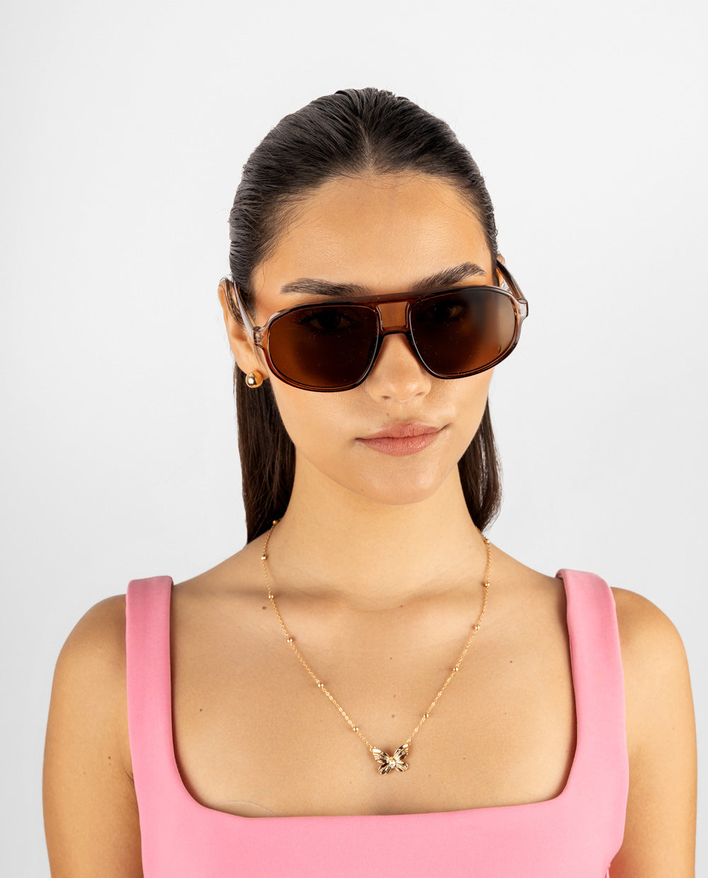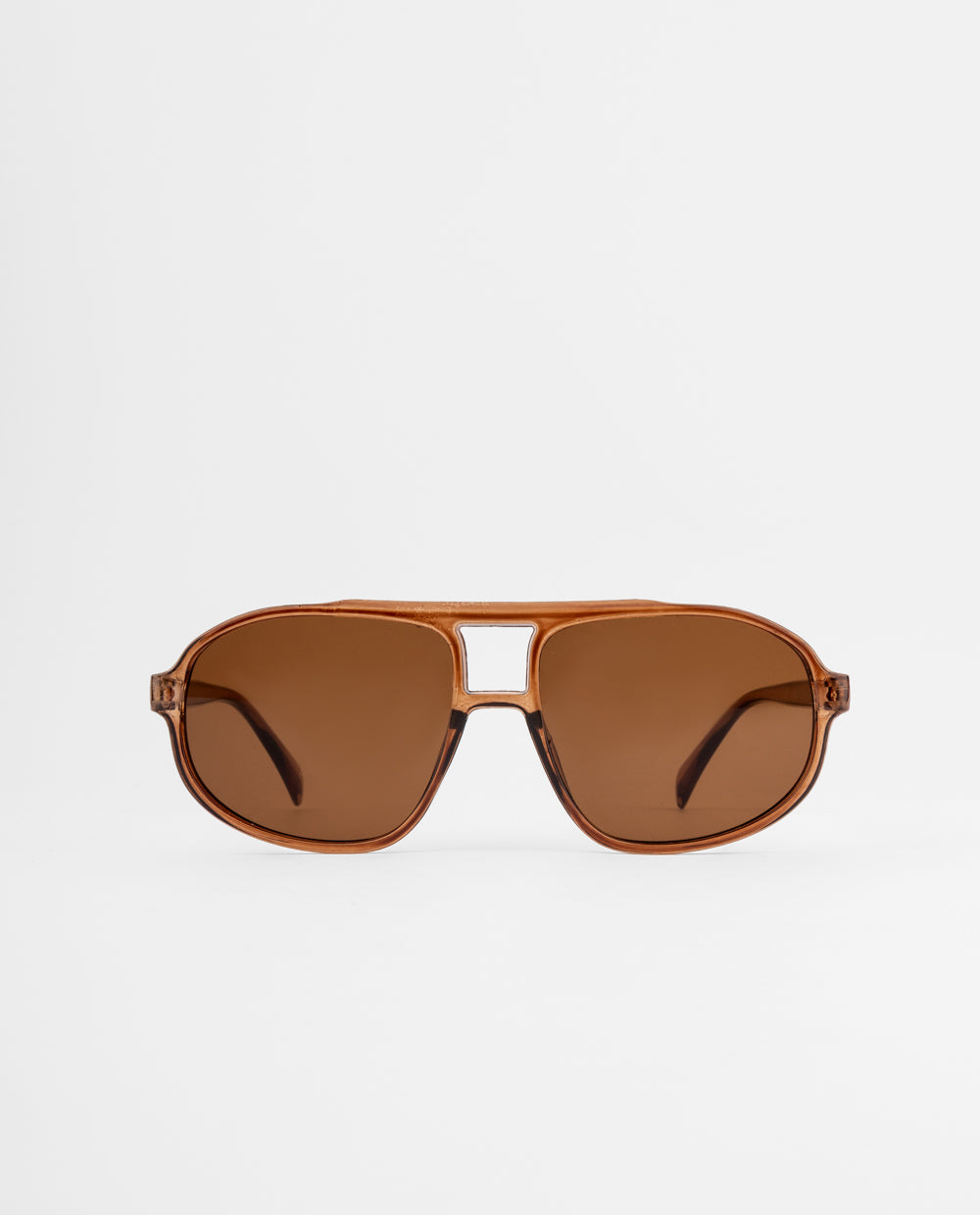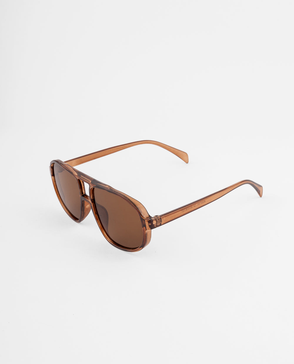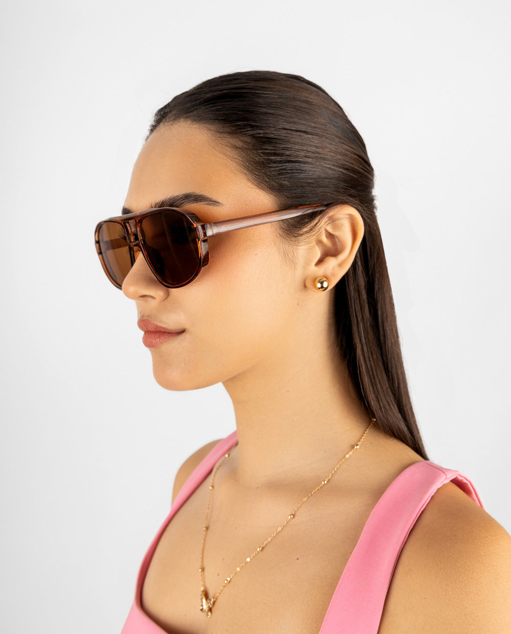 Lentes de sol con montura transparente en tono ámbar y diseño aviador moderno, equipados con lunas marrones para protección ocular.