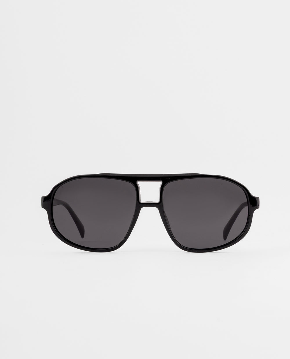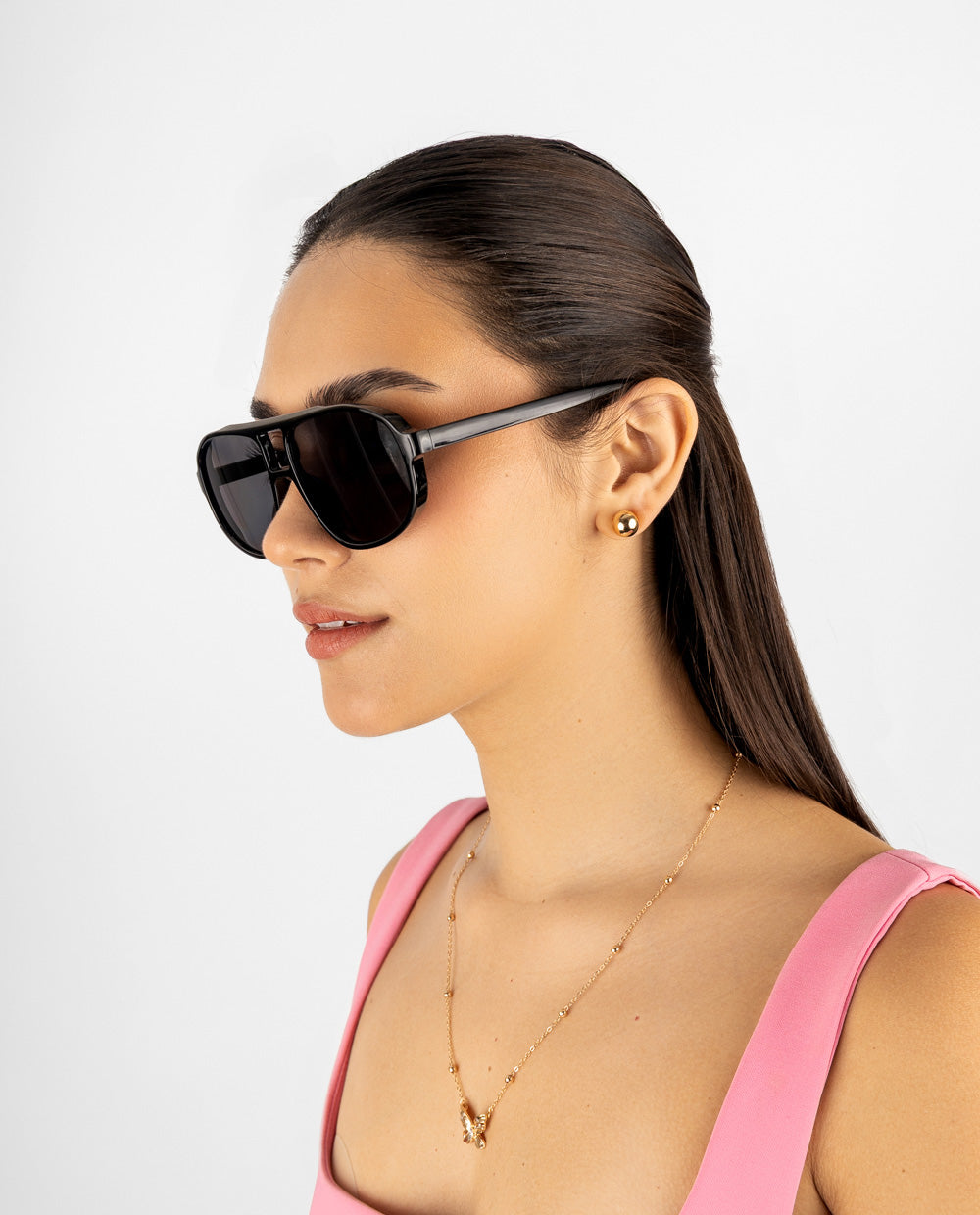 Lentes de sol con montura transparente negra y diseño aviador moderno, equipados con lunas negras para protección ocular.