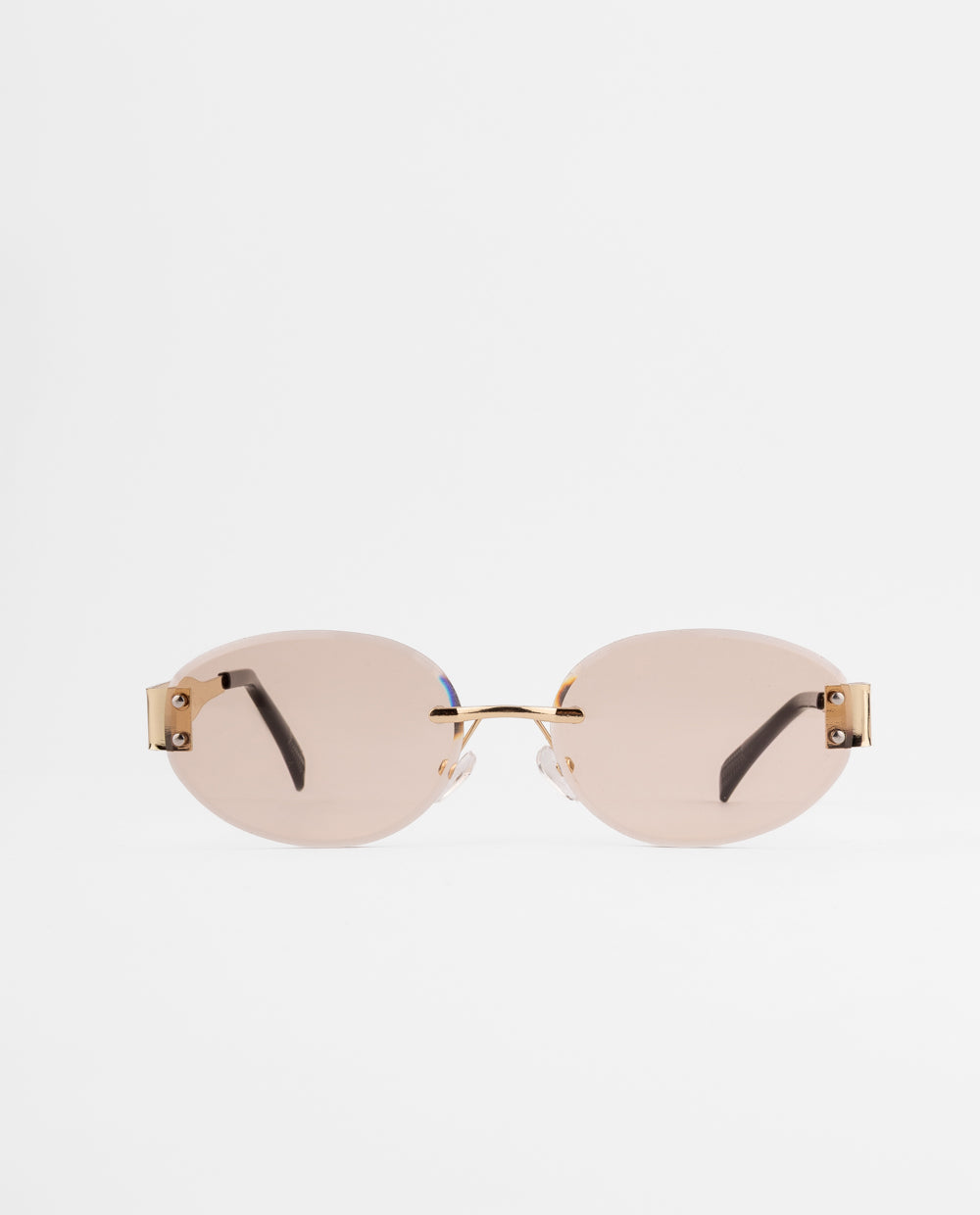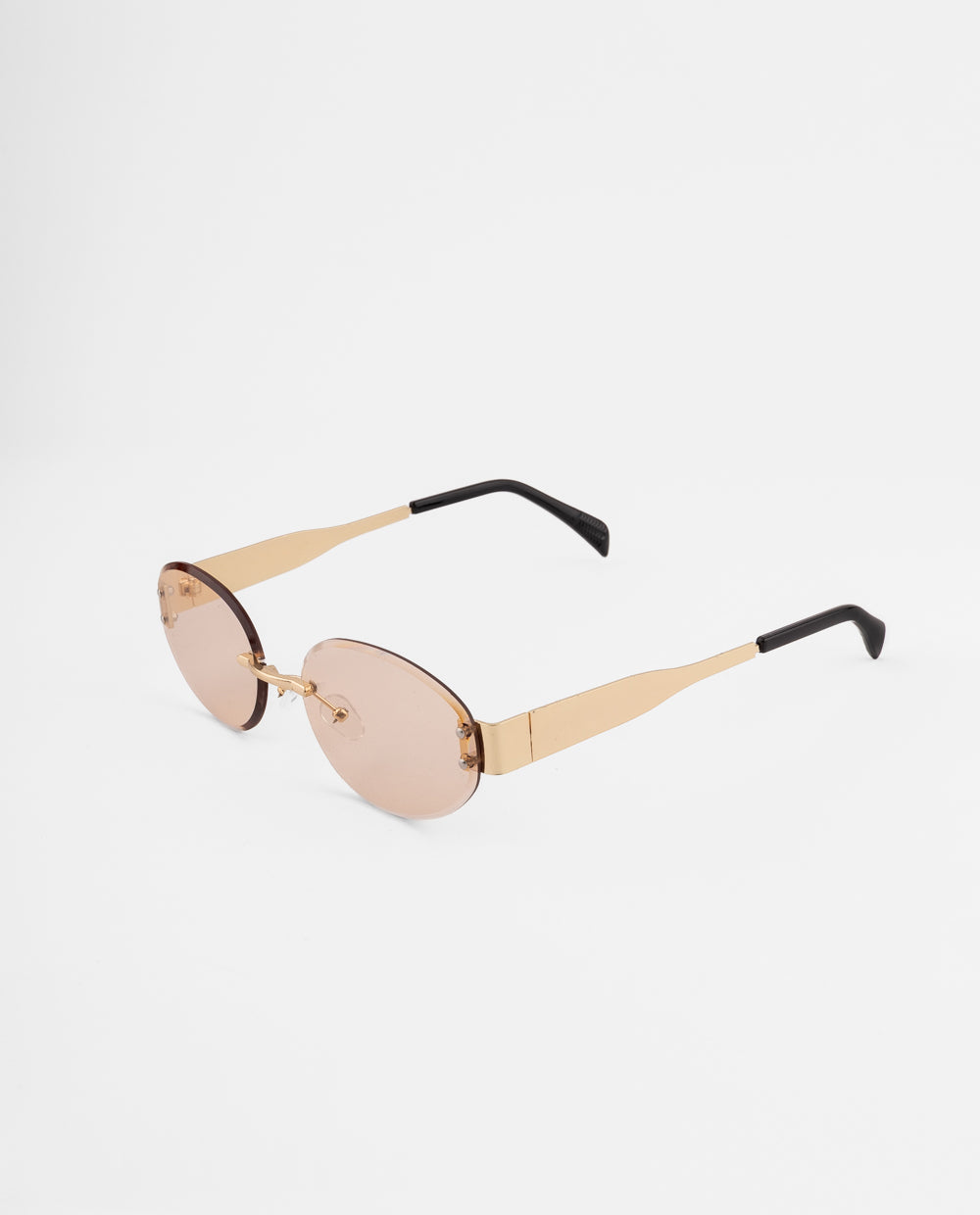 Lentes de sol ovalados con diseño sin marco y lunas en tono rosado claro, combinados con un puente metálico dorado.
