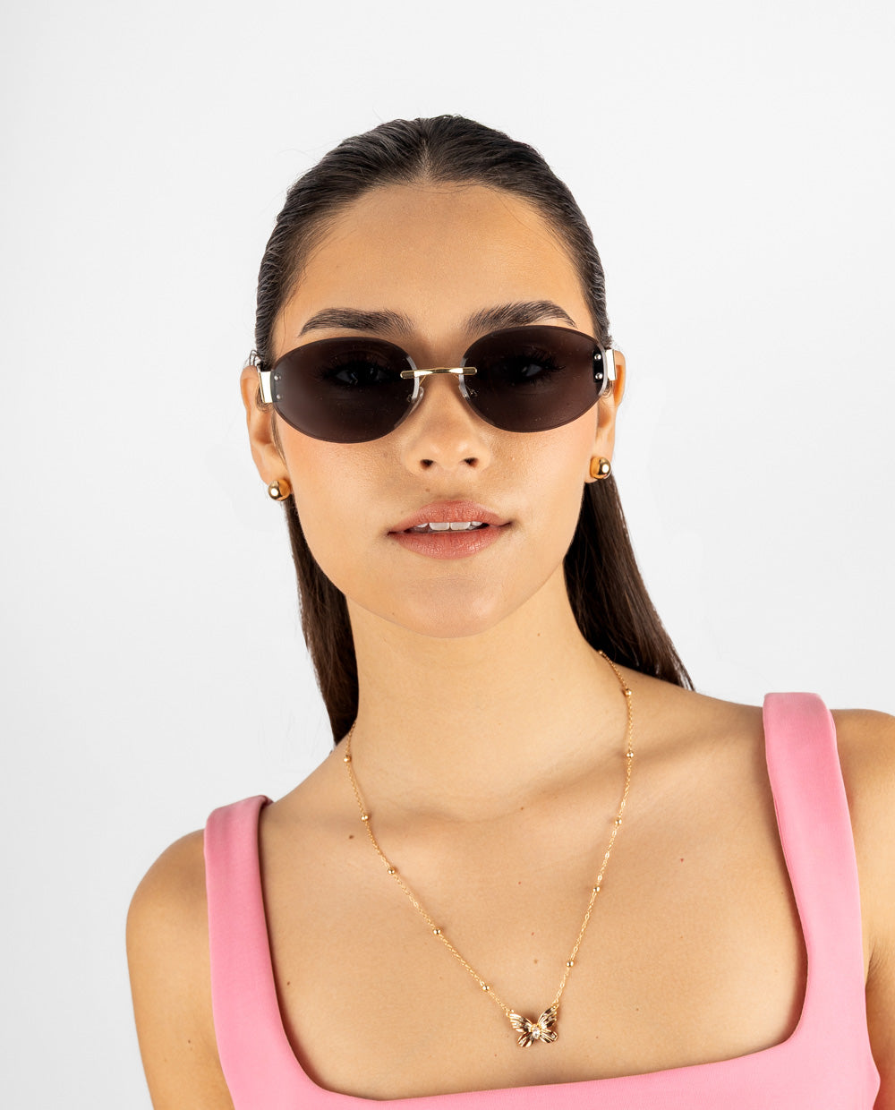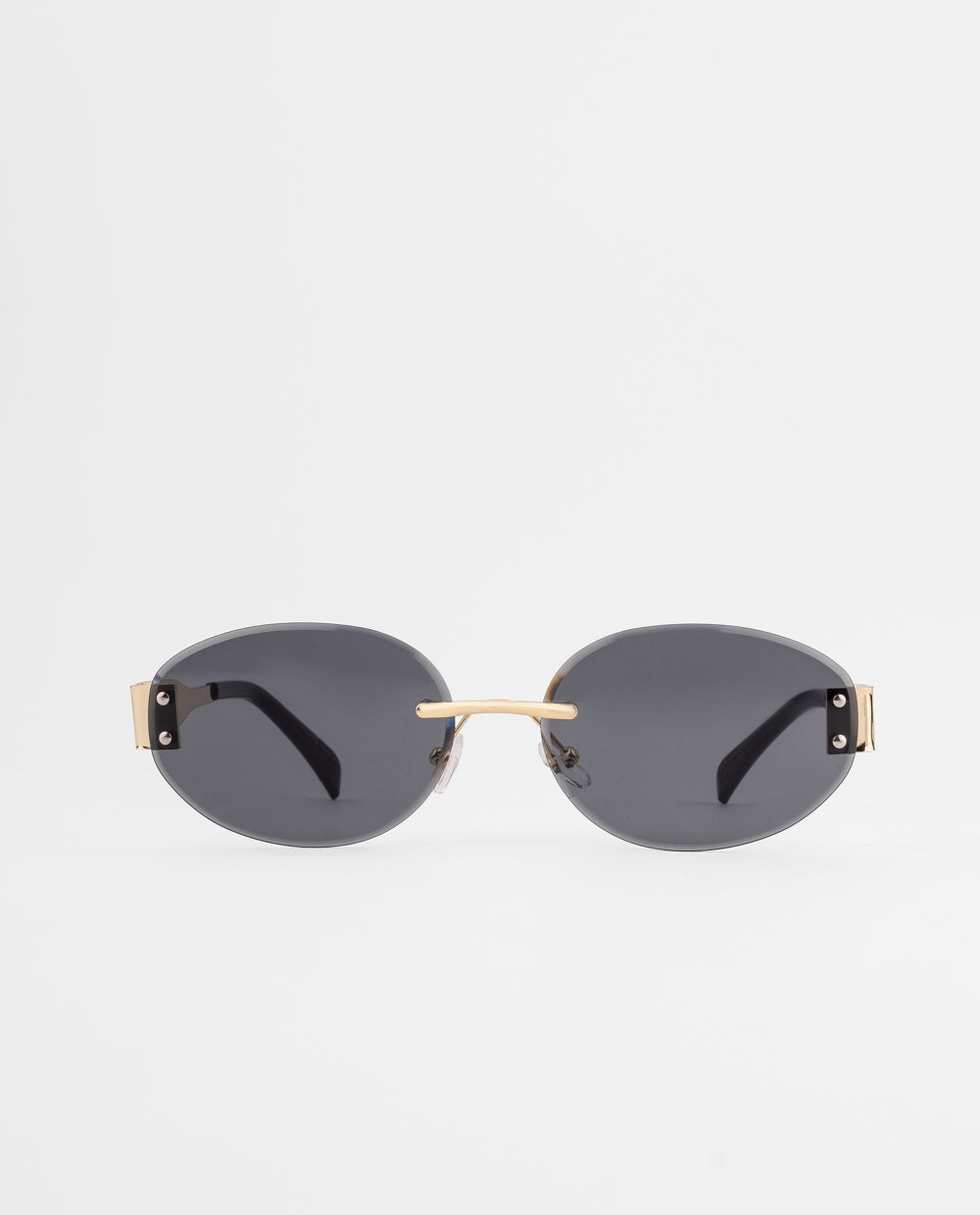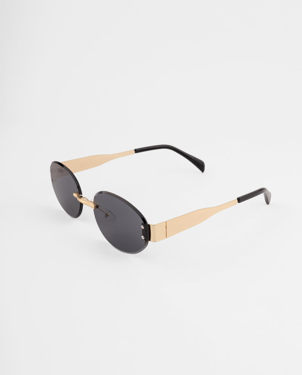 Lentes de sol ovalados con diseño sin marco y lunas negras, combinados con un puente metálico dorado.