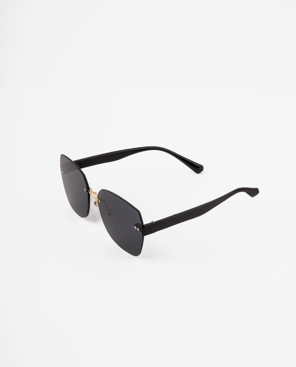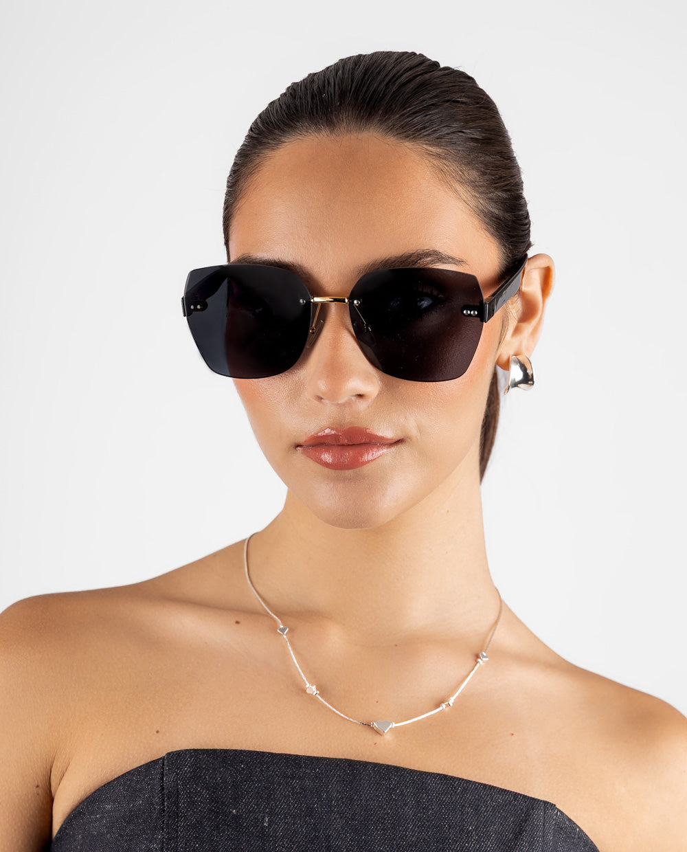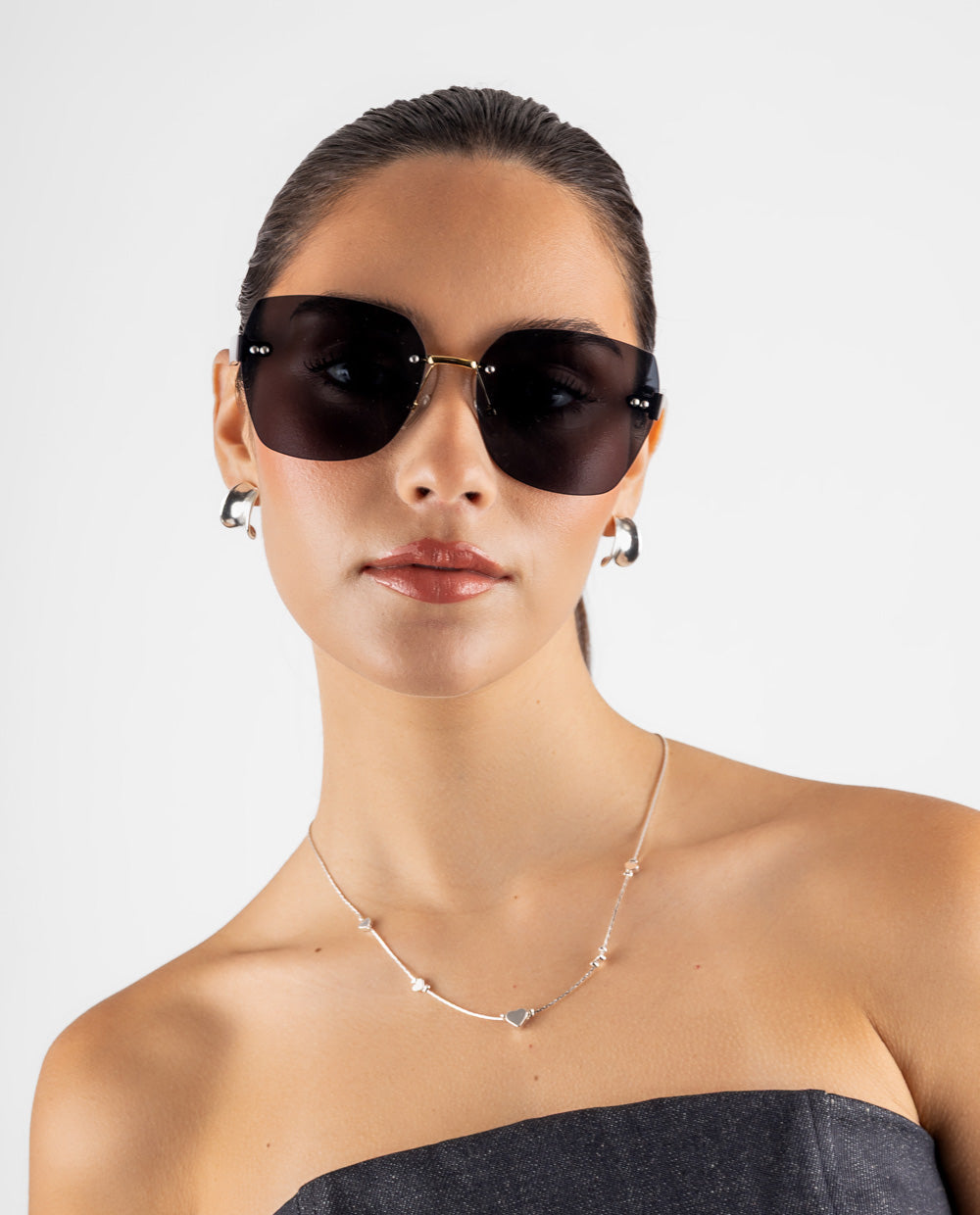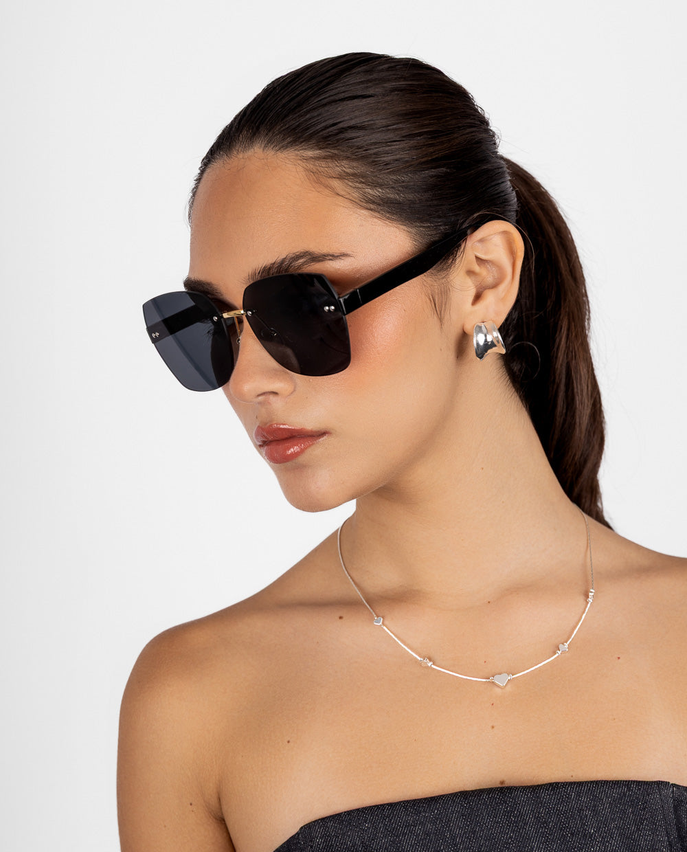 Lentes de sol oversized con montura metálica ligera y lunas negras completas que aportan un look elegante y atemporal. Ideales para elevar outfits urbanos, acompañar looks casuales con denim o protegerte con estilo en días soleados. Un accesorio versátil que combina moda y funcionalidad para brillar en cualquier ocasión.