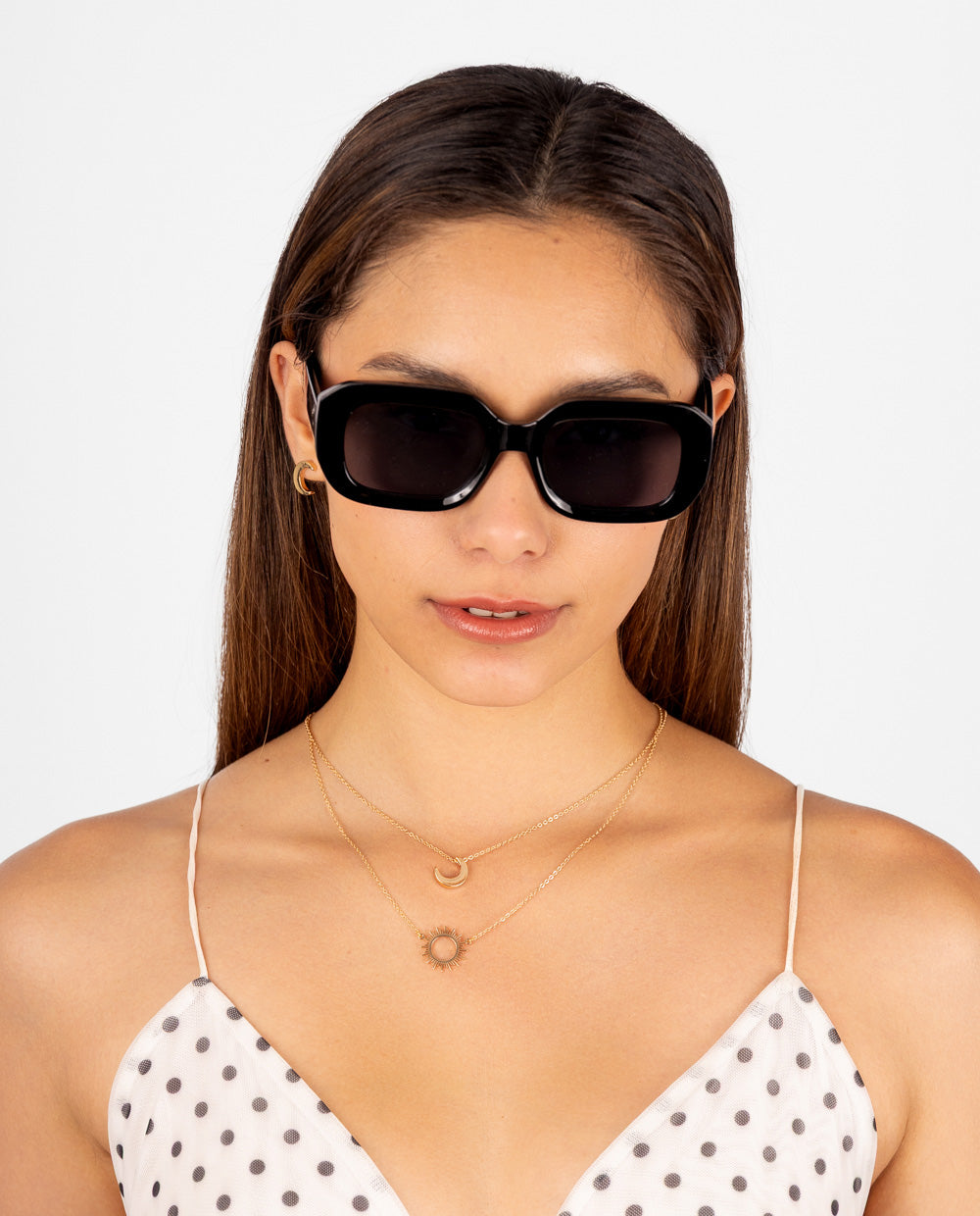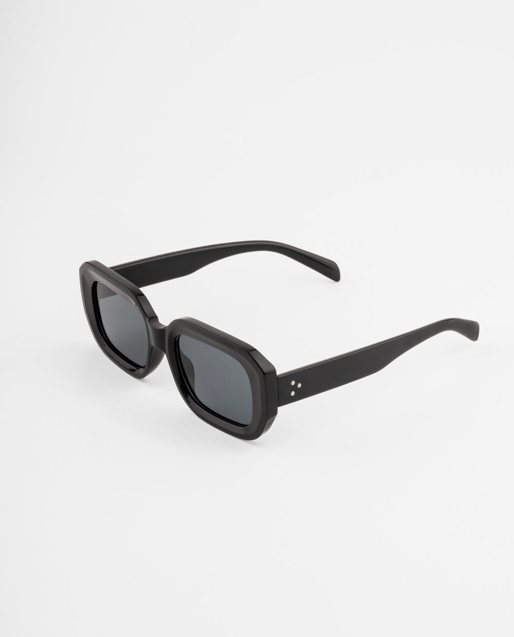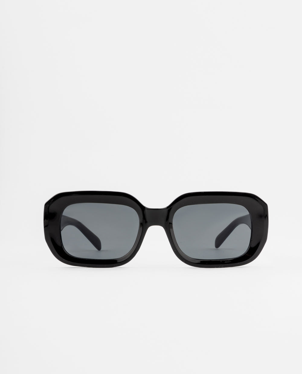 Lentes de sol con marco rectangular grueso en color negro y micas oscuras. Su diseño moderno aporta un toque sofisticado y atrevido a cualquier look.