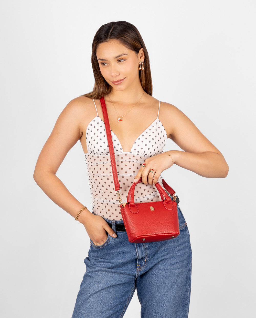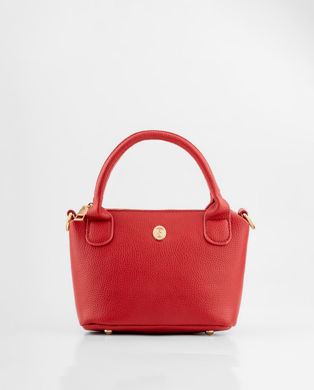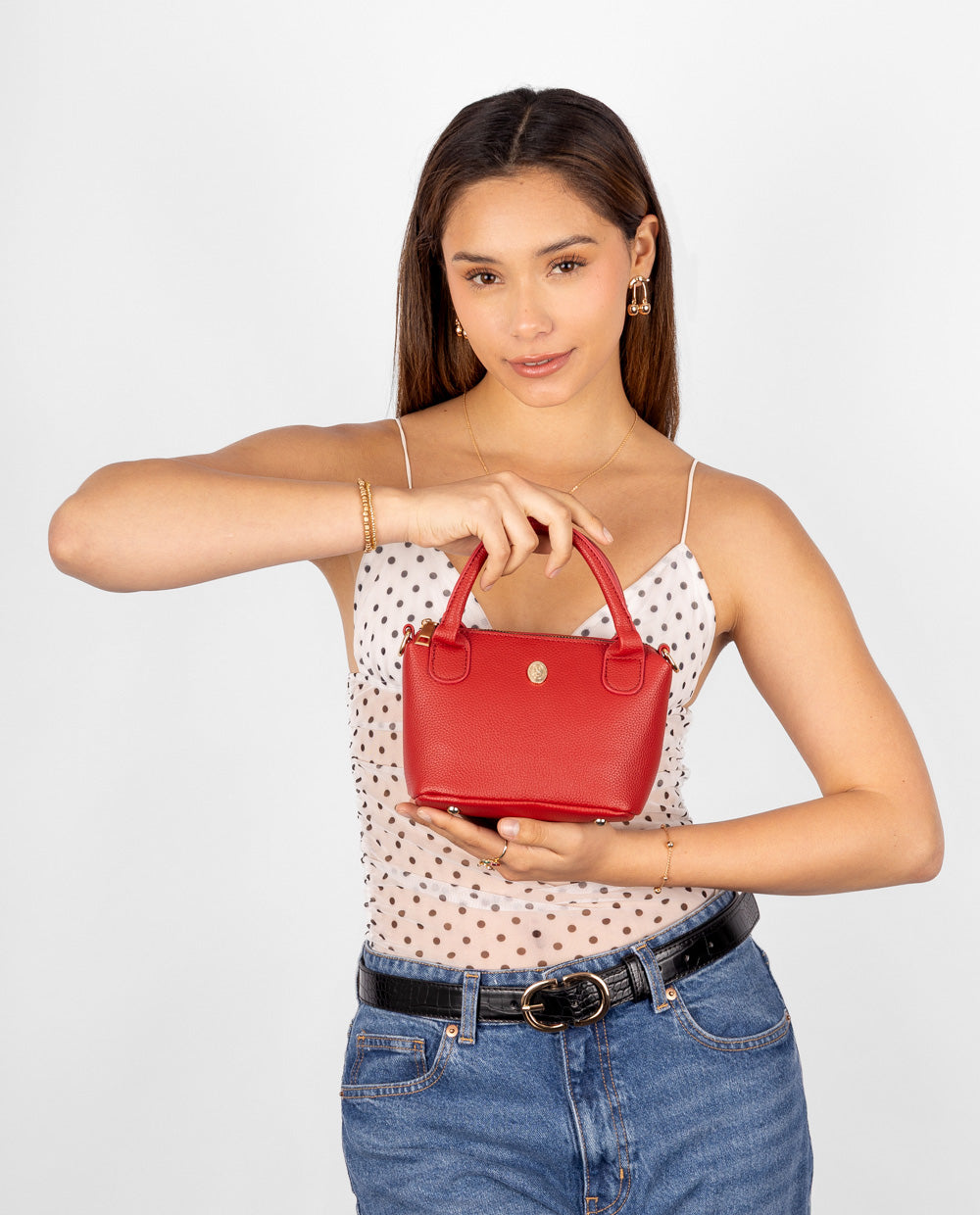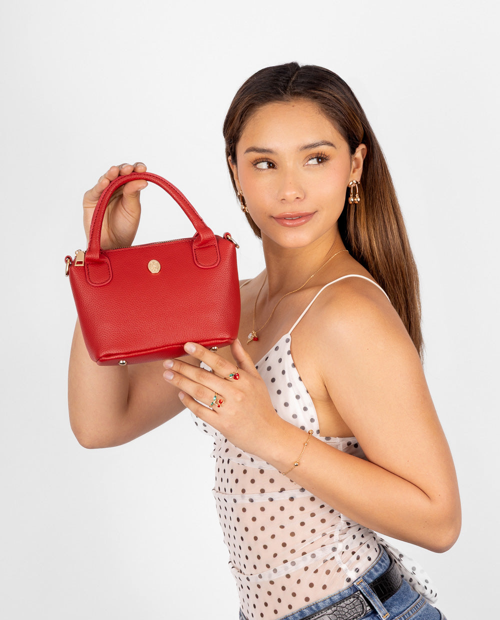 Mini cartera roja en material PU con textura graneada y herrajes dorados. Incluye doble asa para llevar de mano y correa ajustable desmontable para usarla cruzada. Su tamaño compacto y tono rojo la hacen perfecta para sumar energía y estilo a tus looks.