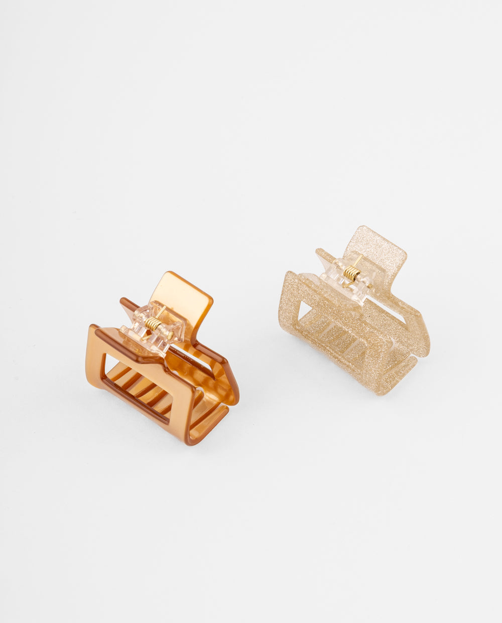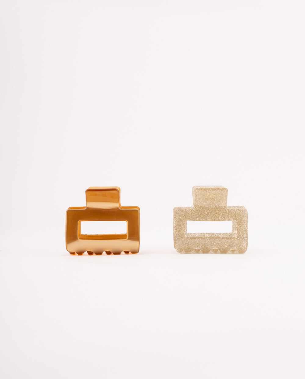 Set de dos mini ganchos rectangulares con acabado brillante y diseño compacto, ideales para sujetar mechones con un toque discreto y moderno.