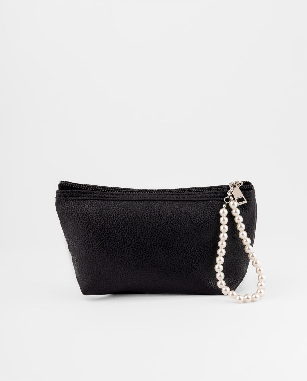Neceser negro en material PU, con asa de perlas que permite usarlo como muñequera — práctico y elegante para llevar tus esenciales.