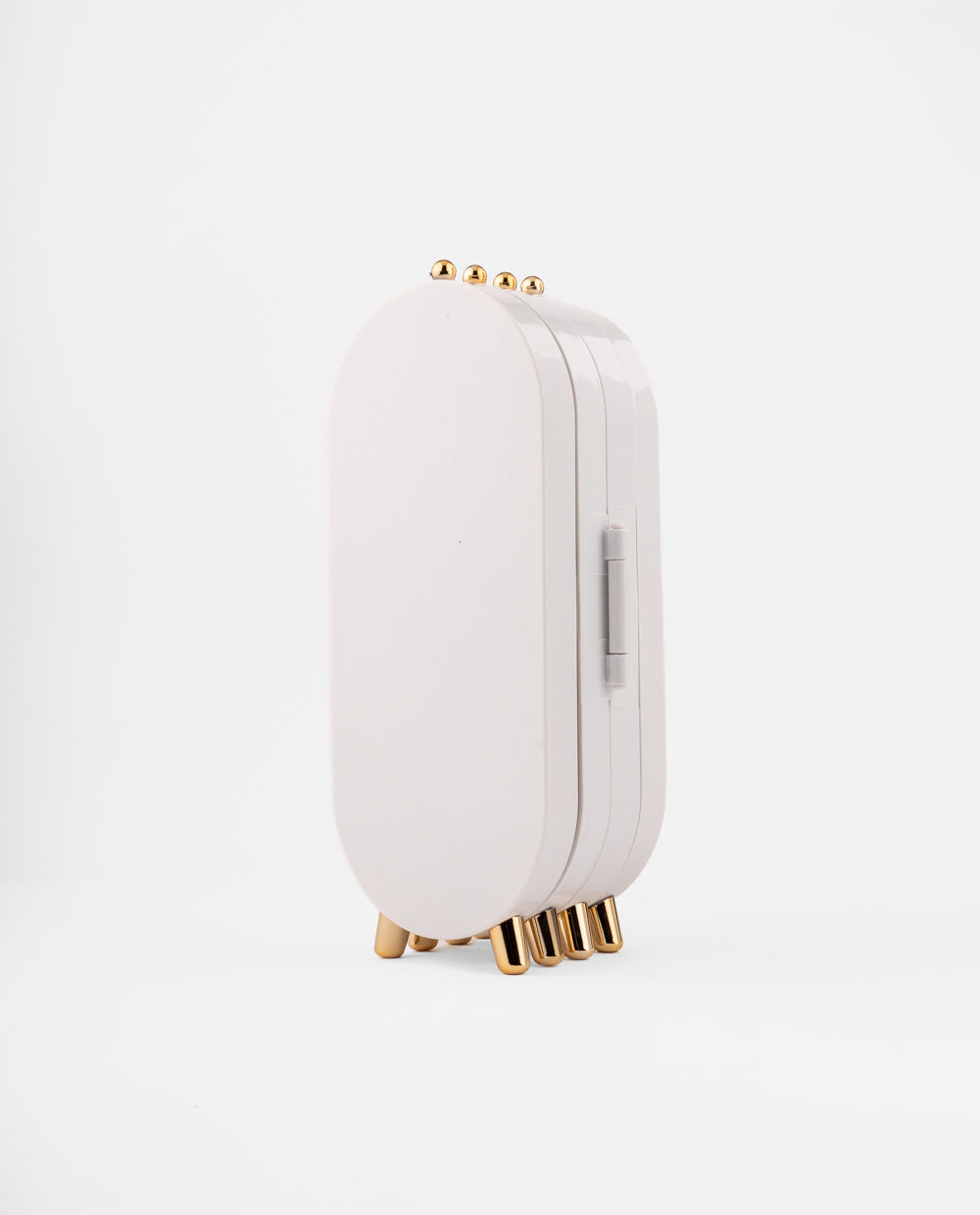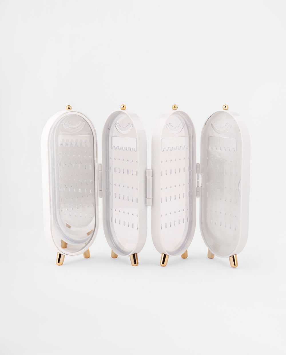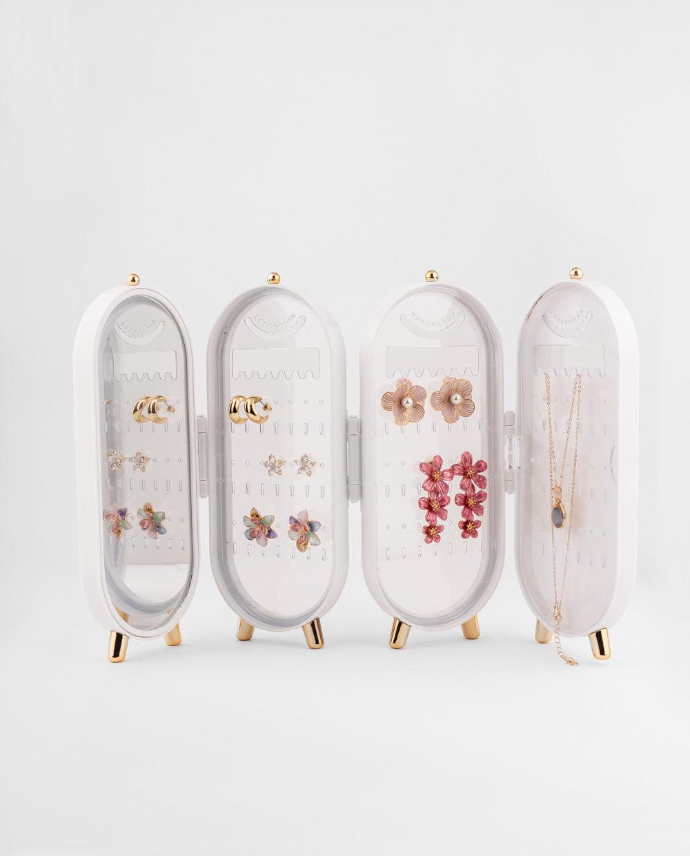 Organizador plegable de cuatro paneles con ranuras para aretes, argollas y collares, diseñado para mantener cada accesorio visible, ordenado y sin enredos.