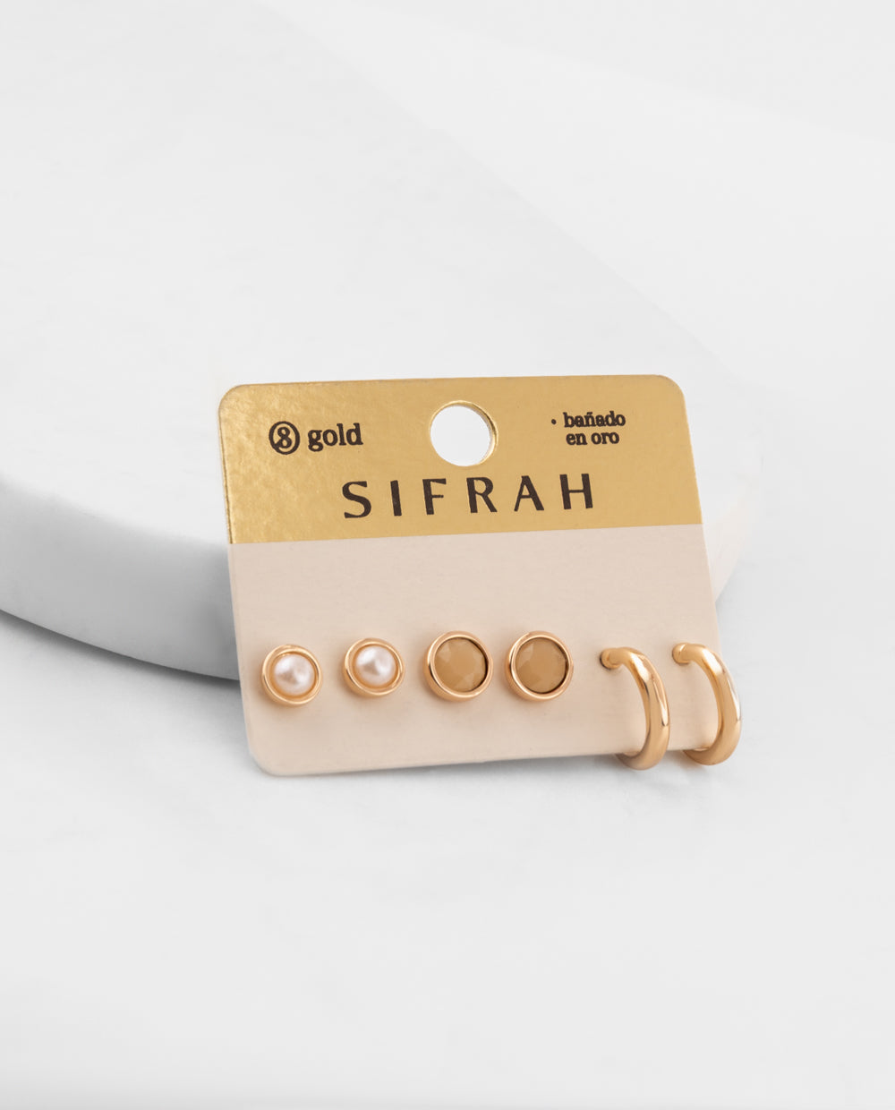 Un set de tres estilos esenciales: argollas clásicas, aretes tipo botón con acabado liso y perlas elegantes. Pertenecen a nuestra colección Premium, bañados en oro y elaborados con materiales hipoalergénicos, ideales para pieles sensibles. Una combinación versátil para brillar en cualquier ocasión.