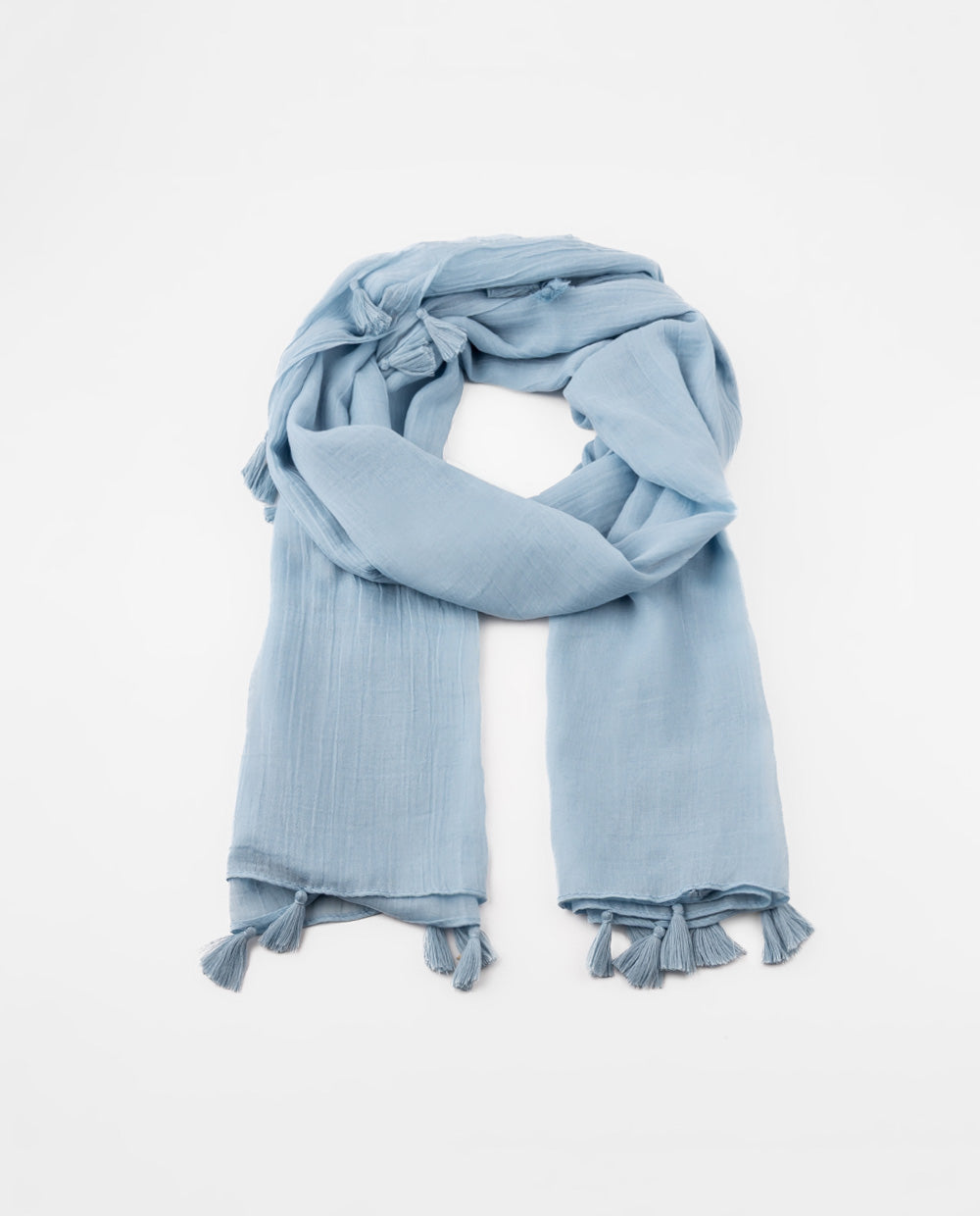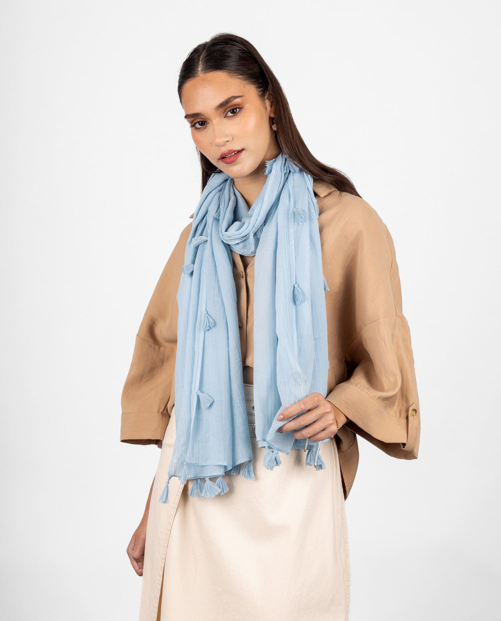 Pashmina en tono celeste que aporta frescura y elegancia a tu estilo. Confeccionada en un tejido ligero y suave, es ideal para complementar looks tanto casuales como más sofisticados. Los flecos decorativos añaden un acabado moderno, convirtiéndola en el accesorio perfecto para realzar cualquier outfit.