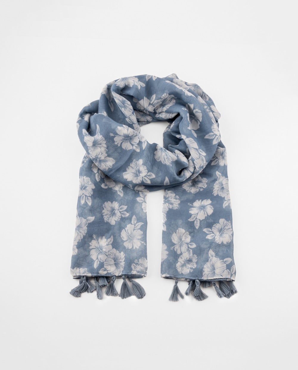 Pashmina en tono azul con delicado estampado floral en contraste y terminaciones con flecos que aportan movimiento y frescura. Un accesorio versátil que complementa looks casuales y elegantes, ideal para darle un toque femenino y chic a cualquier ocasión.