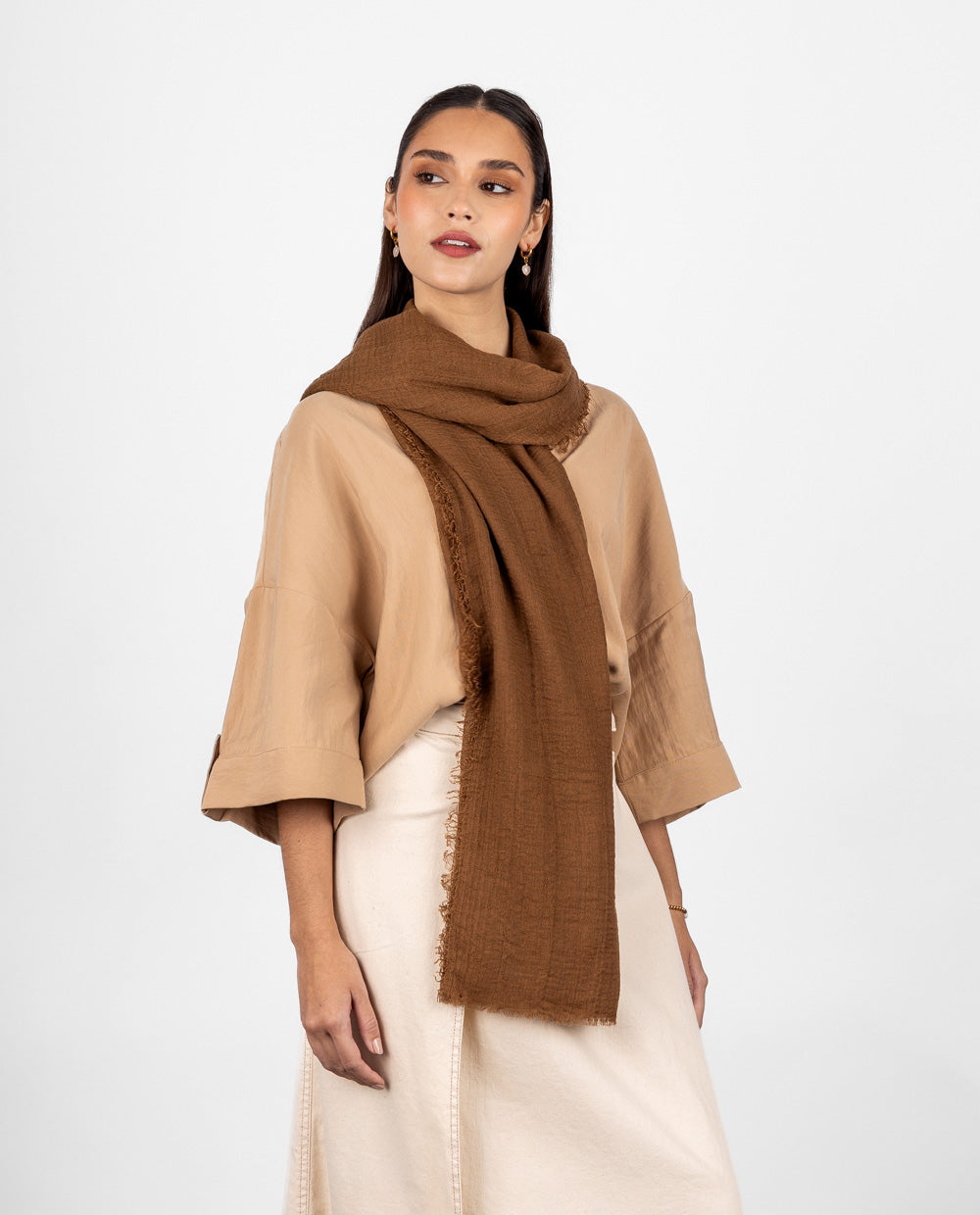 Pashmina en tono marrón de acabado liso y textura ligera, perfecta para elevar tus looks con un toque elegante y cálido. Su diseño versátil te permite usarla al cuello, sobre los hombros o incluso como complemento chic en climas frescos. Un básico atemporal que combina con todo tu guardarropa.