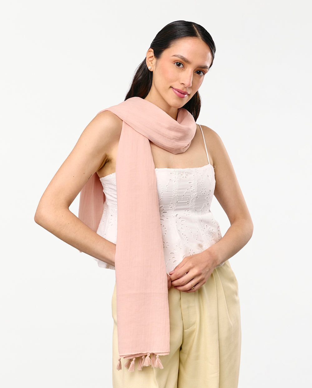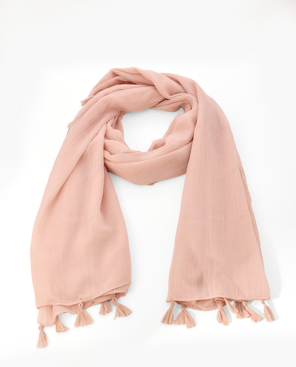 Pashmina ligera en color rosado, de textura suave y caída fluida, con terminaciones en borlas que aportan un toque elegante y versátil.