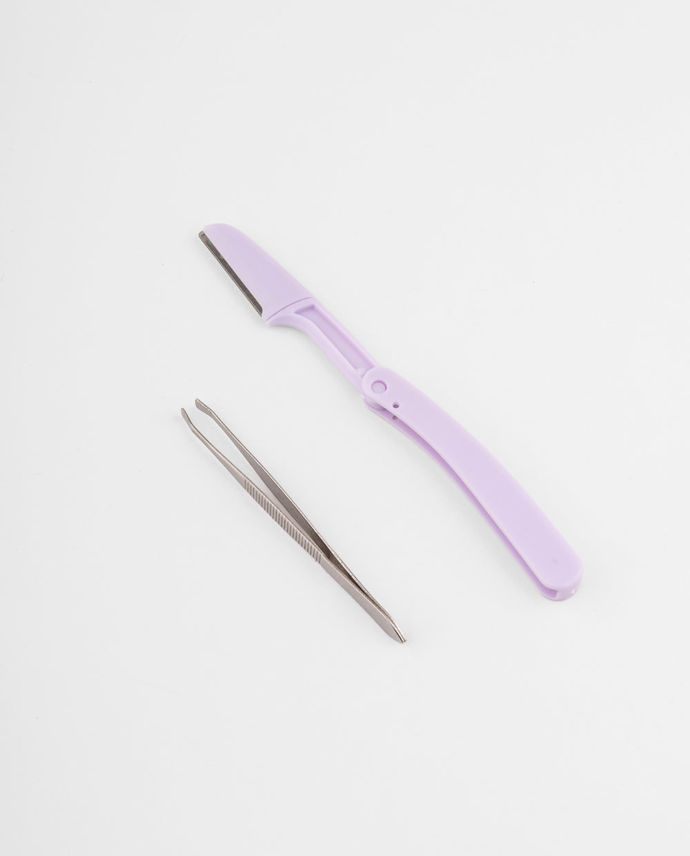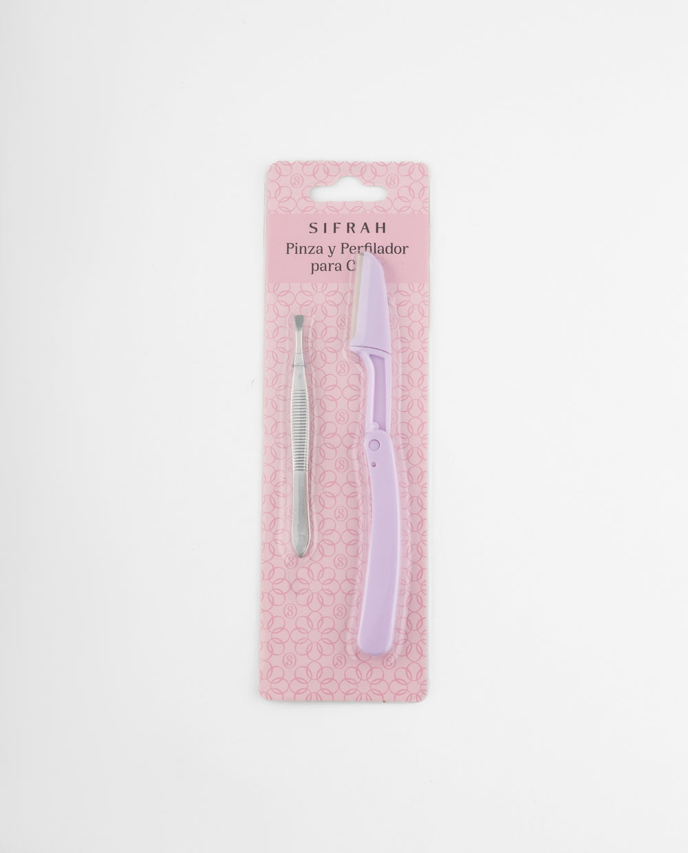 Set compuesto por una pinza metálica de precisión y un perfilador plegable con tapa protectora para definir y dar forma a las cejas con control y seguridad.