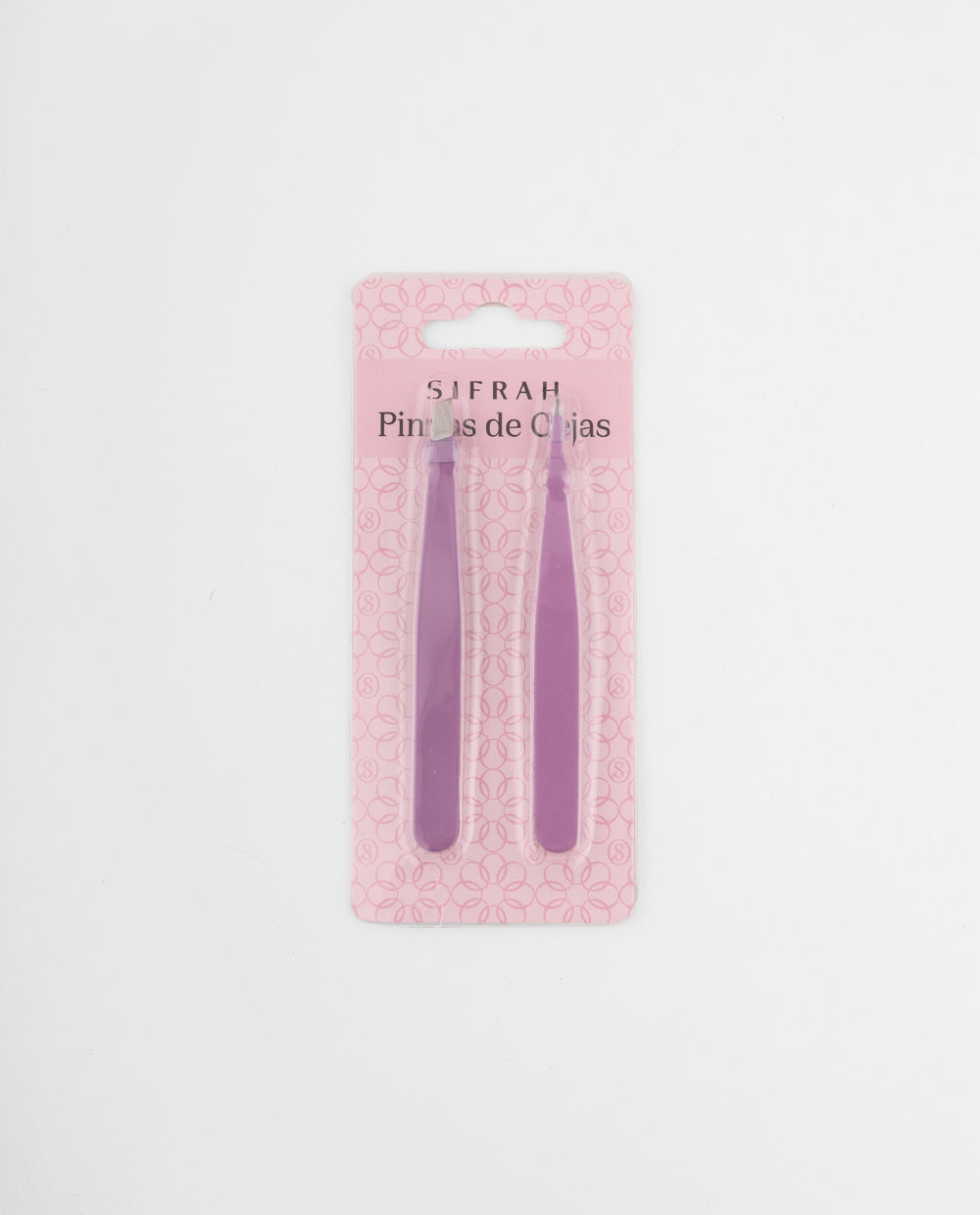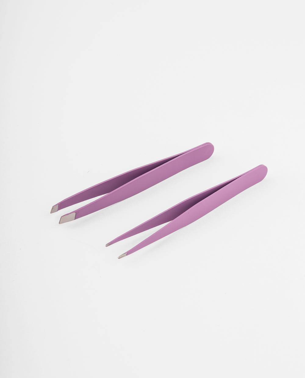 Set de dos pinzas moradas de cejas con puntas precisas y mango ergonómico, ideales para definir y retirar vellos con mayor control.