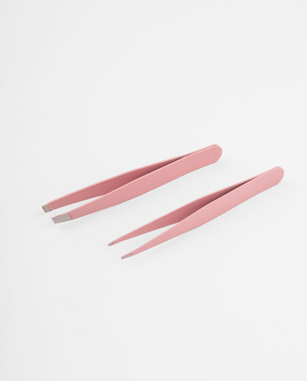 Set de dos pinzas rosadas de cejas con puntas precisas y mango ergonómico, ideales para definir y retirar vellos con mayor control.