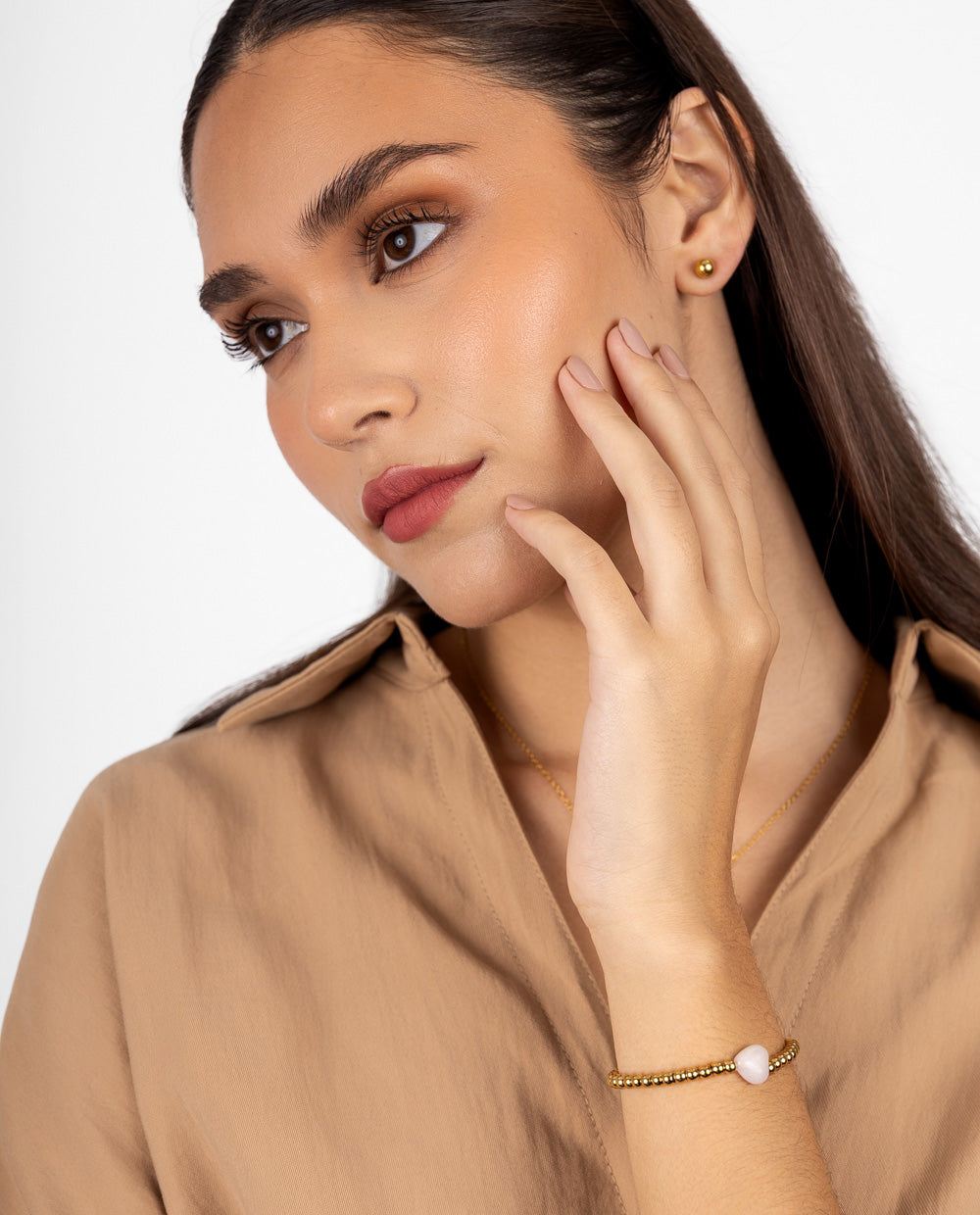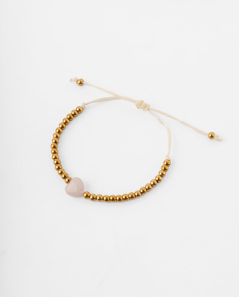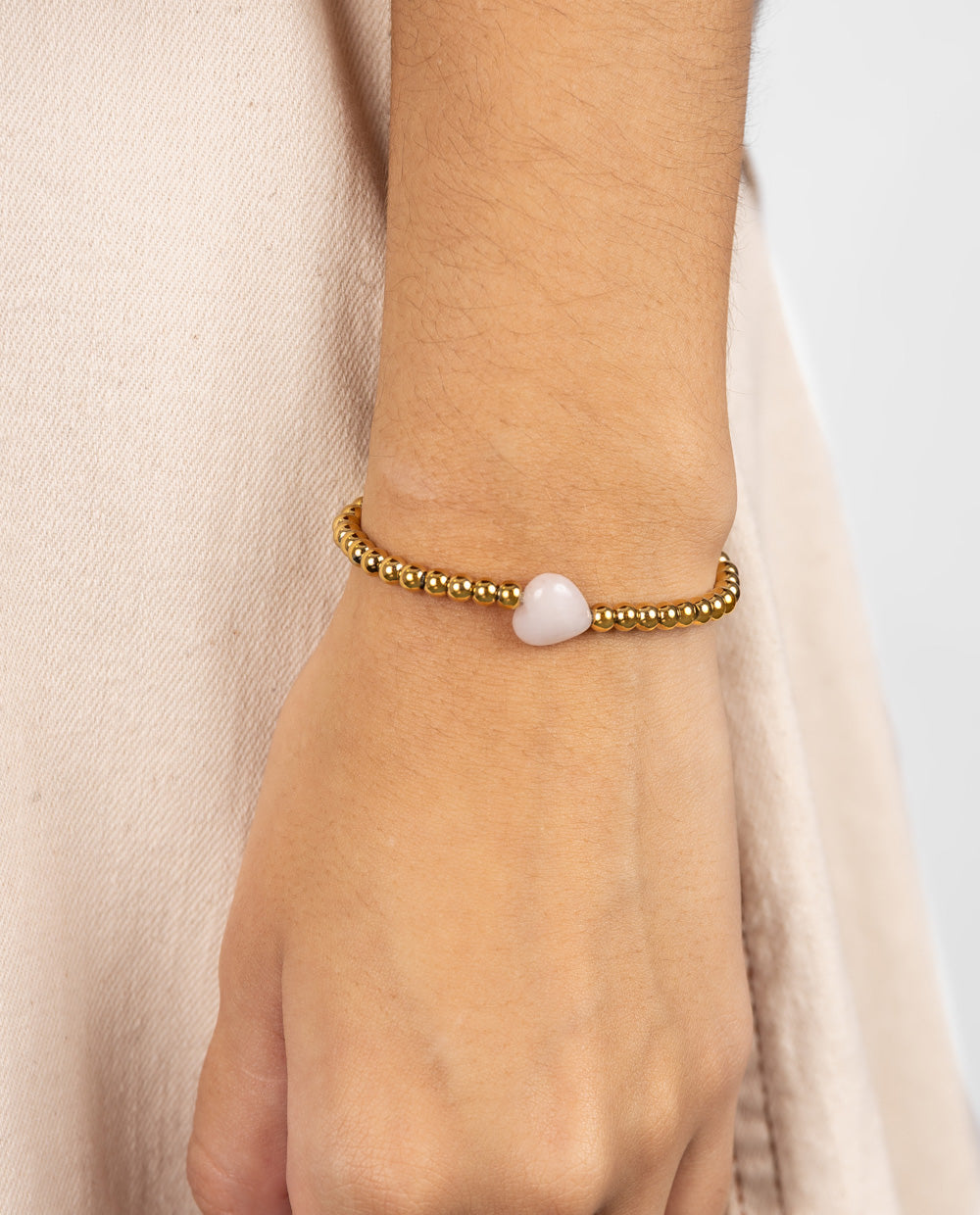 Pulsera de acero inoxidable bañado en oro, diseñada con delicadas cuentas doradas y un corazón central de cuarzo blanco. Su cierre ajustable asegura comodidad y adaptabilidad. Un accesorio versátil que combina elegancia y frescura, ideal para llevar sola o apilar con otras pulseras.