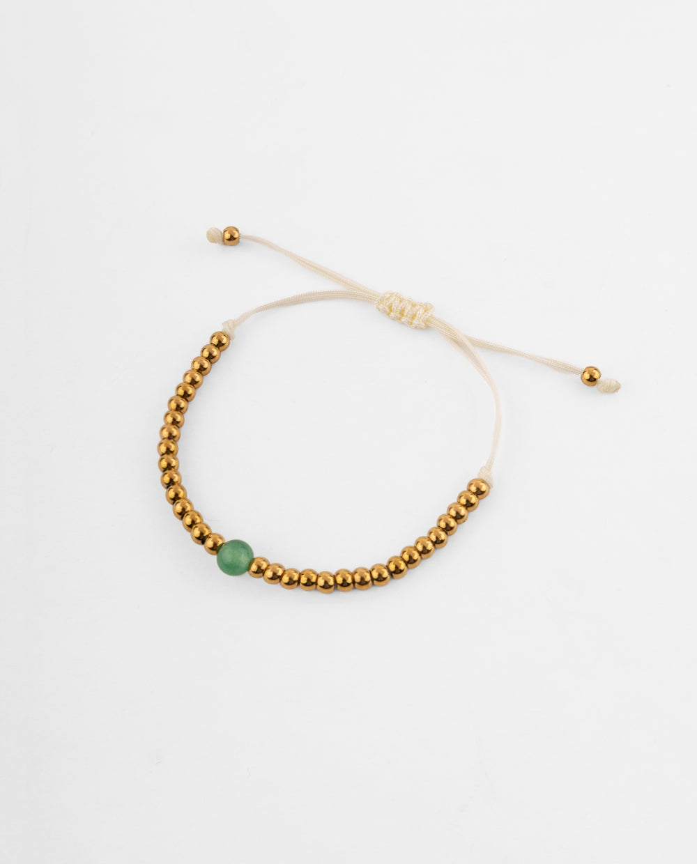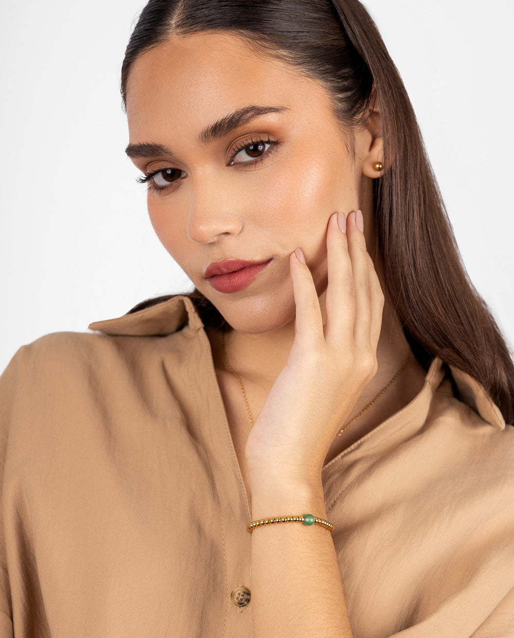 Pulsera elaborada en acero inoxidable bañado en oro, con delicadas cuentas doradas y piedra natural de cuarzo amazonita como protagonista. Su diseño ajustable la hace práctica y cómoda, ideal para usar todos los días. Un accesorio que combina elegancia y energía, perfecto para llevar sola o en layering con otras pulseras de la colección.