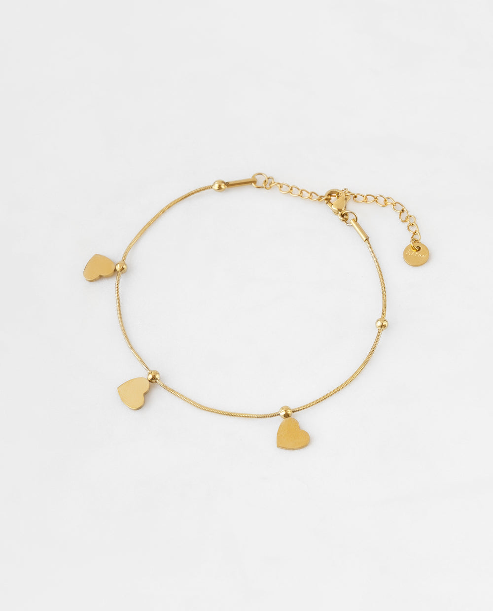 Pulsera fina y elegante elaborada en acero inoxidable con baño en oro, decorada con delicados dijes de corazones. Su diseño minimalista refleja ternura y sofisticación, ideal para llevar sola o combinar con otros accesorios. Resistente y atemporal, es el complemento perfecto para elevar cualquier look.