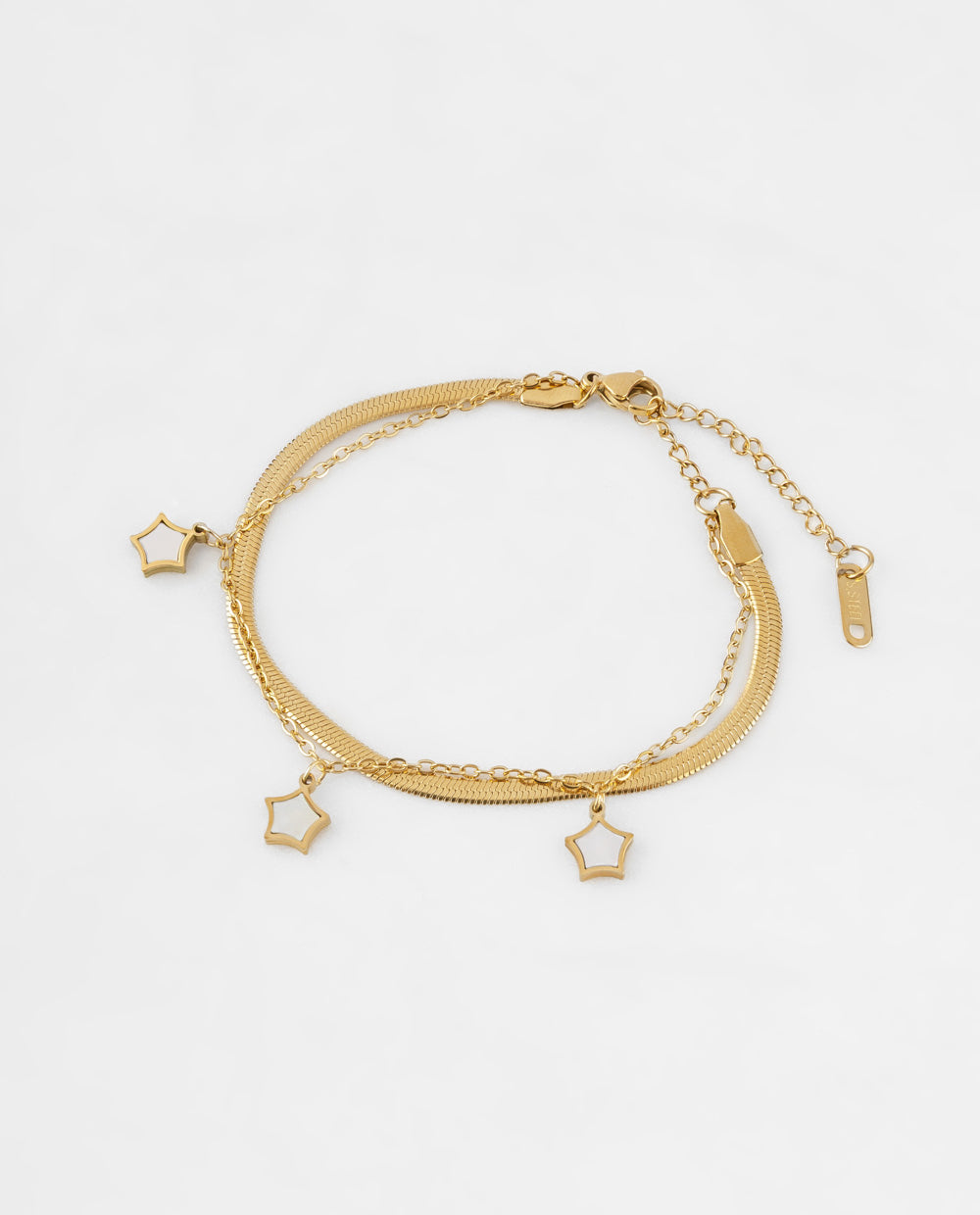Pulsera elaborada en acero inoxidable y bañada en oro, con dijes de estrellas que aportan un toque sutil y elegante. Su diseño moderno y resistente la convierte en un accesorio versátil para usar en el día a día o en ocasiones especiales. Un detalle que ilumina tu look con estilo y sofisticación.
