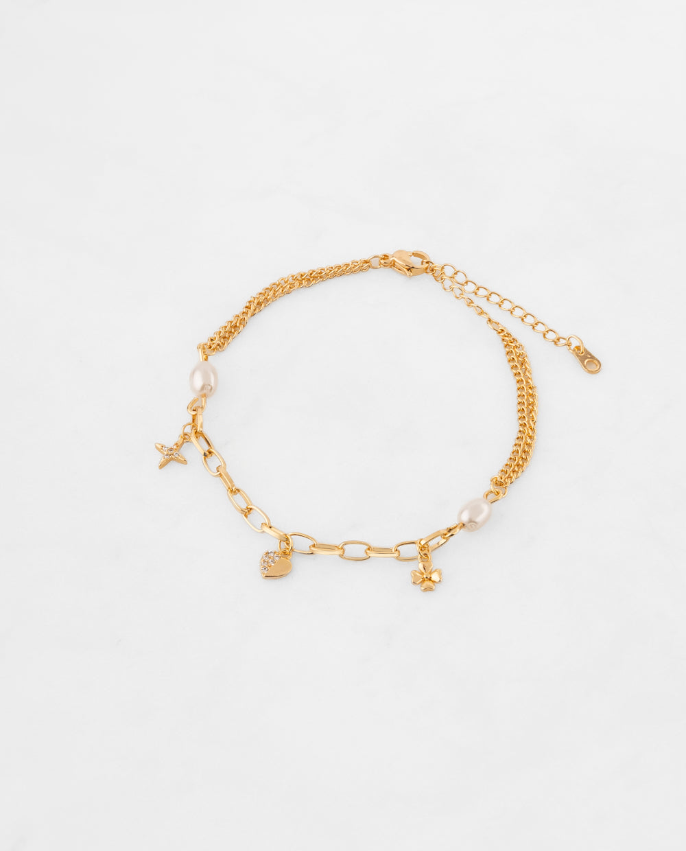 Pulsera dorada bañada en oro con mezcla de cadenas, perlas decorativas y charms decorados con pedrería de zircón — reconocida por su brillo y durabilidad.