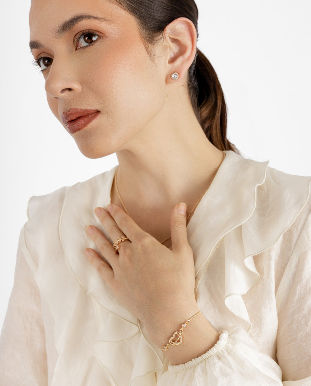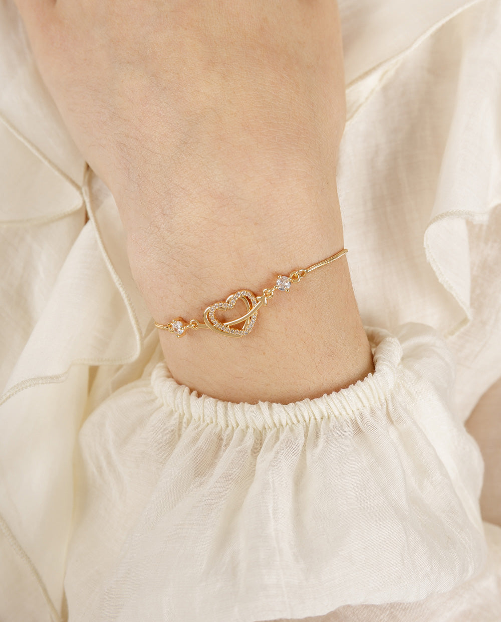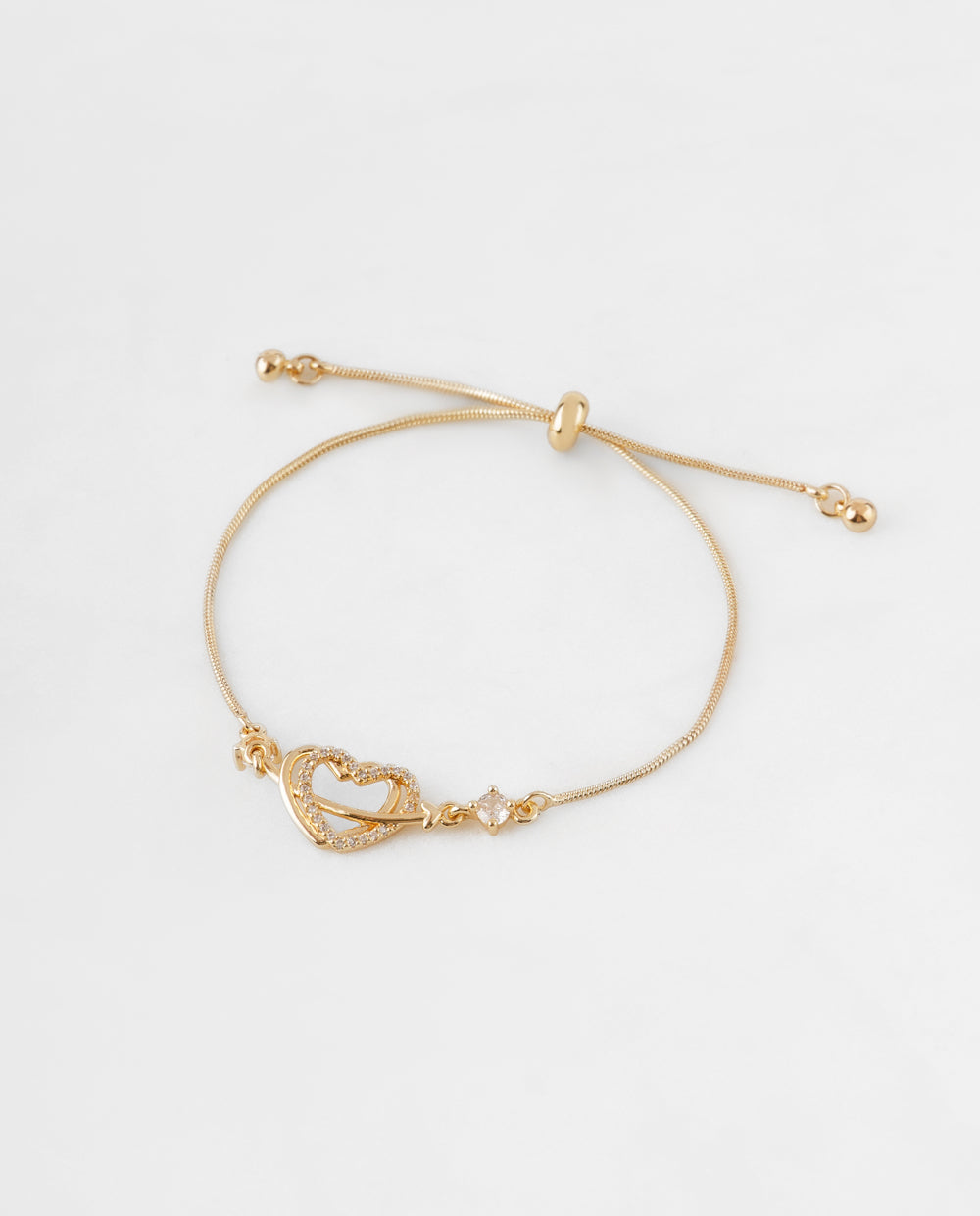 Pulsera dorada ajustable con dije de corazón entrelazado y detalles de pedrería de zircón que aportan brillo y sofisticación. Su acabado en baño de oro la convierte en una pieza elegante y versátil, ideal para elevar tanto looks diarios como de ocasión especial. Una joya de la colección Glow pensada para reflejar delicadeza y estilo único.