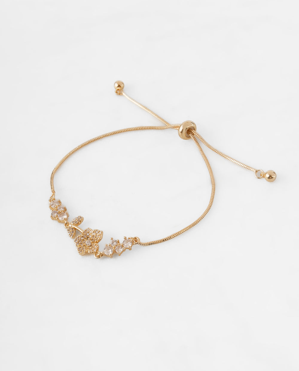 Pulsera dorada ajustable decorada con un delicado diseño de hojas incrustadas con pedrería de zircón, aportando brillo y sofisticación. Su acabado en baño de oro realza su durabilidad y elegancia, convirtiéndola en el accesorio perfecto para acompañar tanto looks cotidianos como de ocasión especial. Una pieza de la colección Glow que refleja frescura y estilo atemporal.