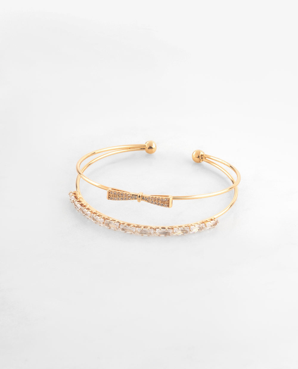 Pulsera dorada abierta bañada en oro con detalle de lazo y una línea de zircón, delicada y perfecta para un brillo femenino.