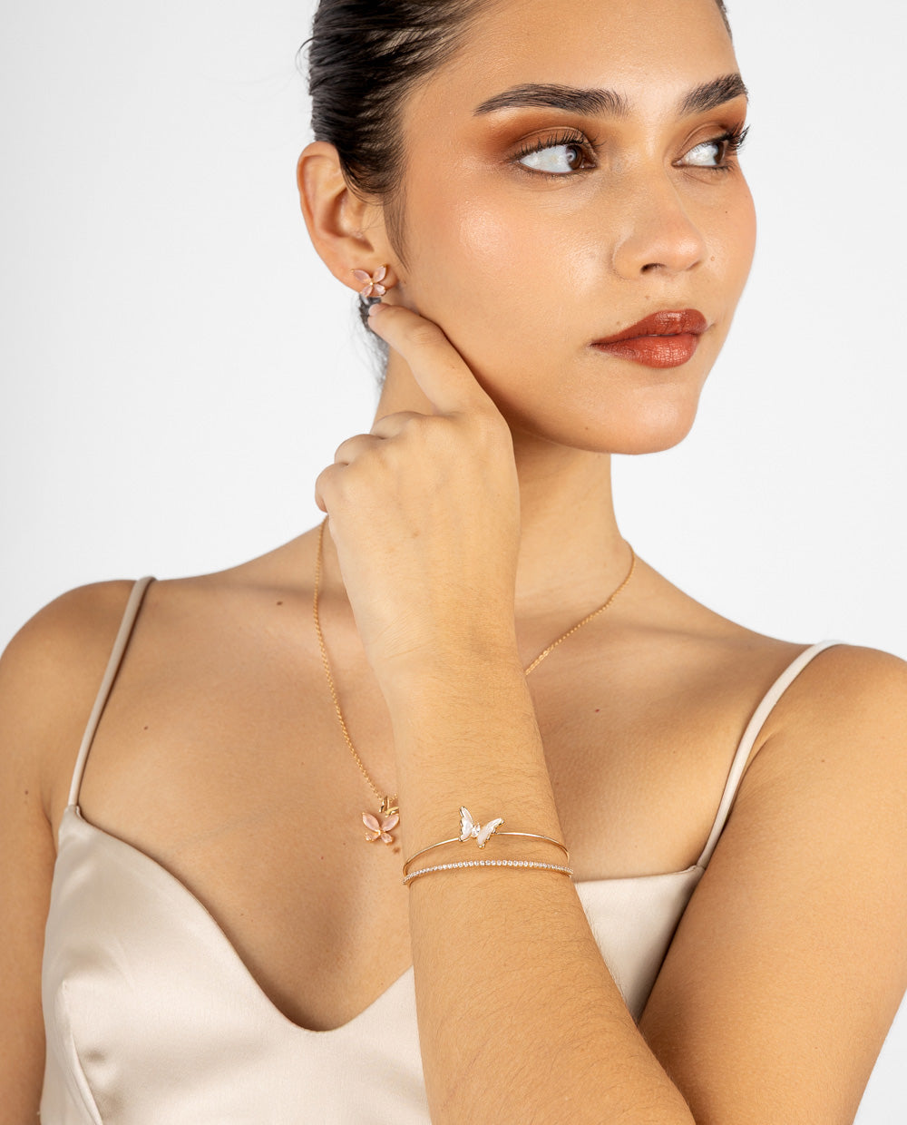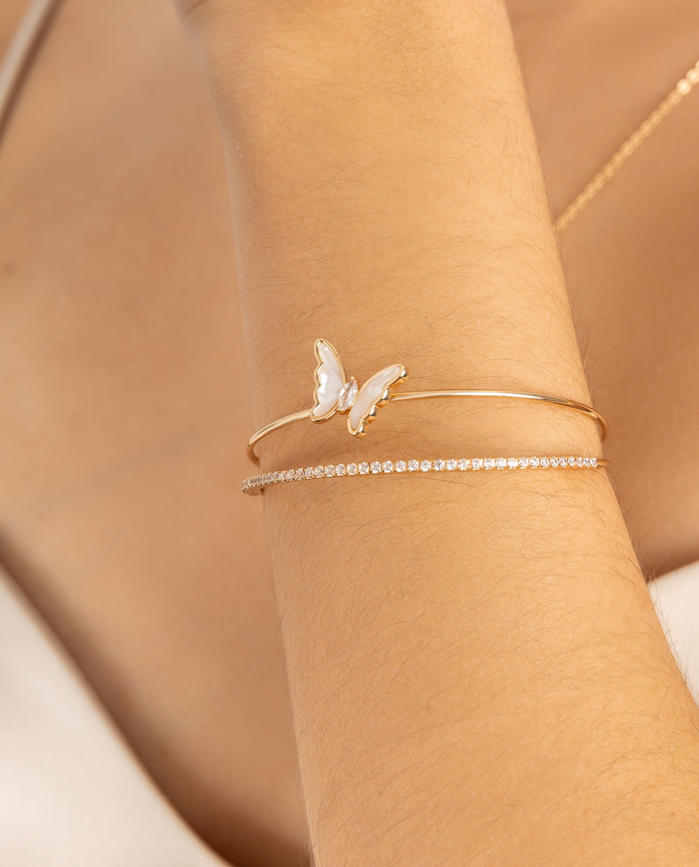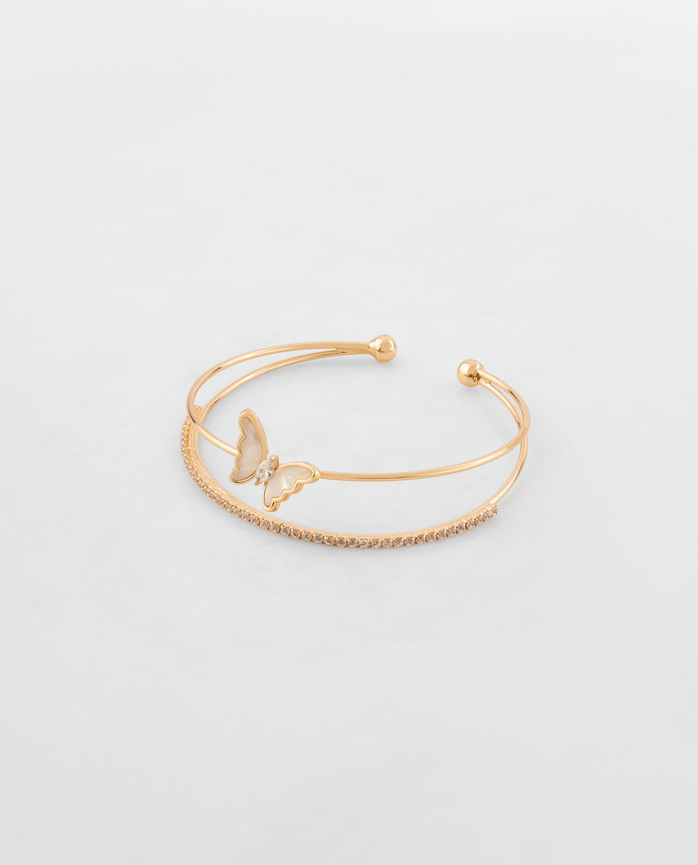 Pulsera dorada abierta bañada en oro con detalle de mariposa en nácar y una línea de zircón, delicada y perfecta para un brillo femenino.
