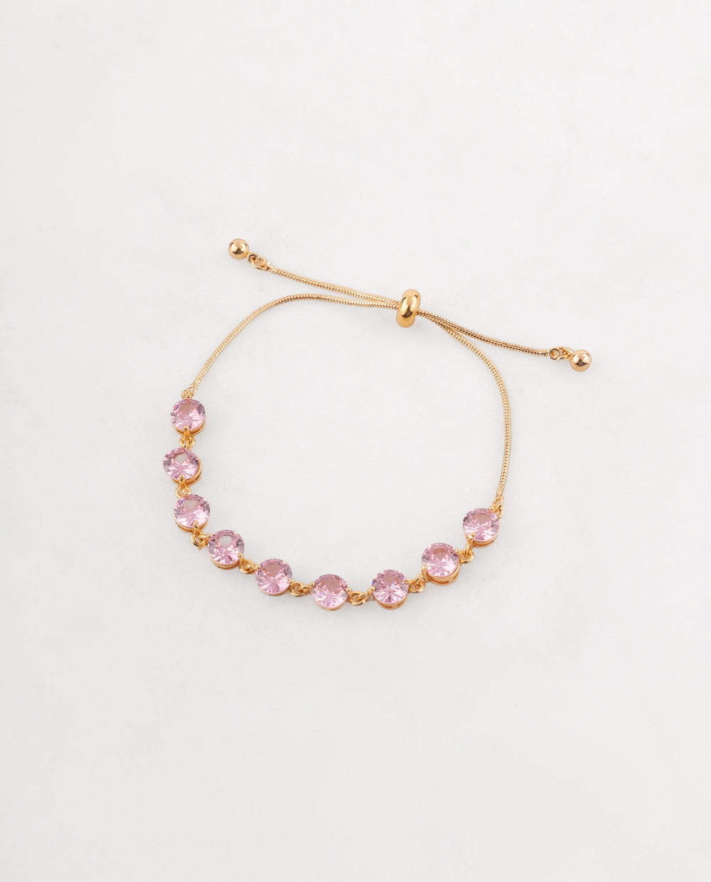 Un accesorio lleno de feminidad y brillo: esta pulsera ajustable combina un delicado cordón dorado con pedrería de zircón en tonos rosa que capturan la luz con cada movimiento. Su diseño regulable permite un ajuste perfecto y cómodo en la muñeca. Ideal para dar un toque romántico y elegante a looks de día o de noche.